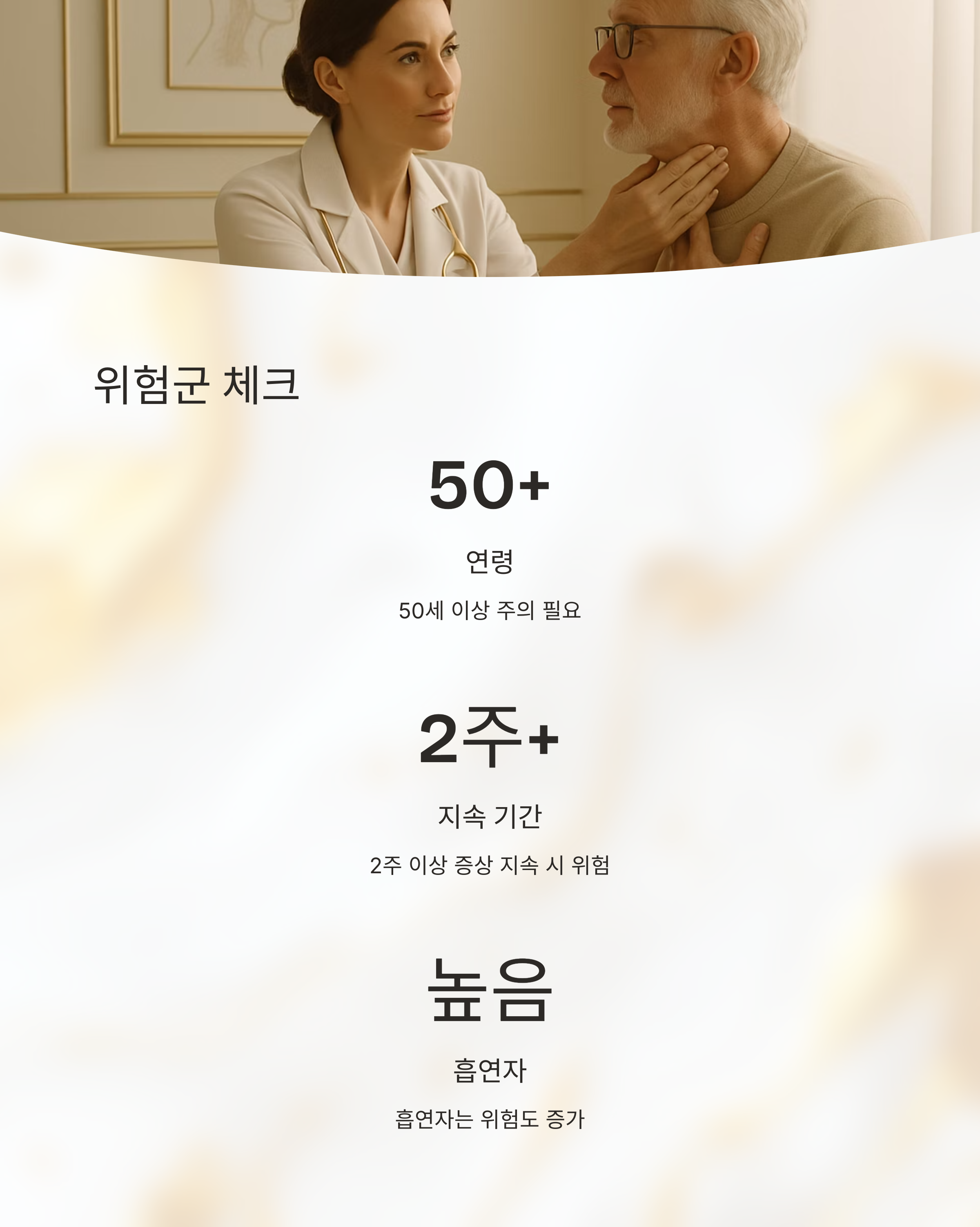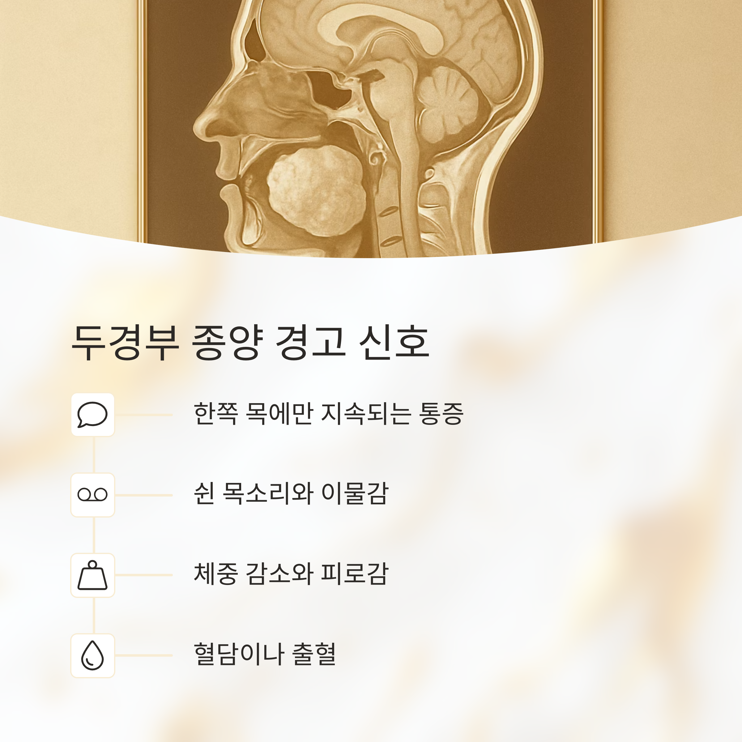 침 삼킬 때 한쪽 목에만 통증이 있거나, 쉰 목소리가 나고 지속적인 이물감을 느낀다면, 심각한 질환일 가능성도 고려해야 해요. 특히 흡연자이거나 50세 이상인 경우 두경부 종양을 의심해 볼 수 있답니다. 체중 감소, 피로감, 한쪽 귀 통증 등이 동반된다면 더욱 주의 깊게 살펴봐야 해요. 2주 이상 증상이 지속되거나 혈담이나 출혈, 혹이 만져진다면 지체 없이 이비인후과 정밀 검사를 받는 것이 중요합니다.