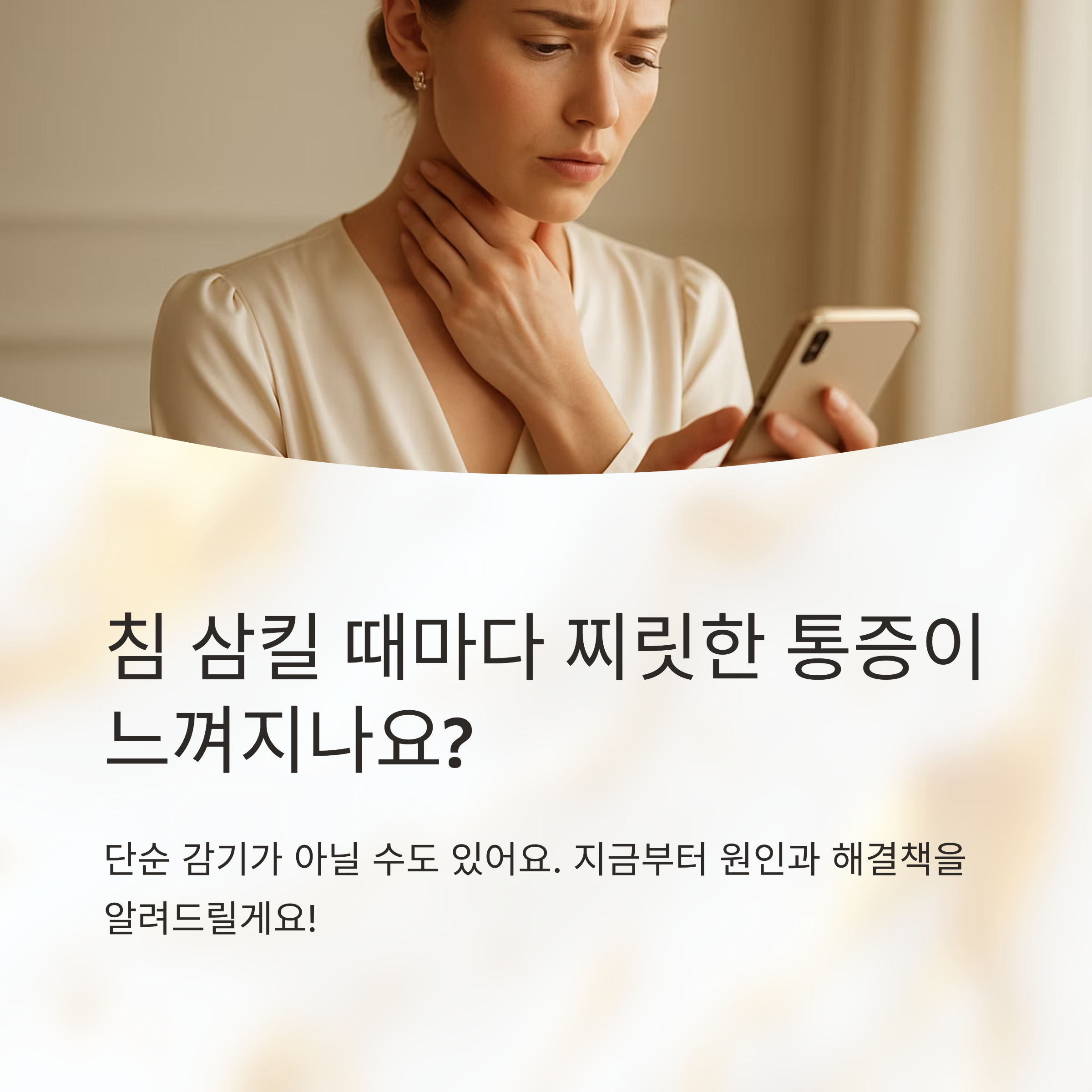 안녕하세요! 침 삼킬 때마다 느껴지는 찌릿한 통증 때문에 걱정이시라면 이 글이 도움이 될 거예요. 감기인가 싶지만 며칠째 낫지 않고, 다른 증상까지 나타난다면 단순히 감기라고만 생각하기엔 어려운 부분이 있죠. 함께 원인을 찾아보고, 혹시 몰랐던 나의 건강 상태를 꼼꼼히 체크해 보도록 하자구요!