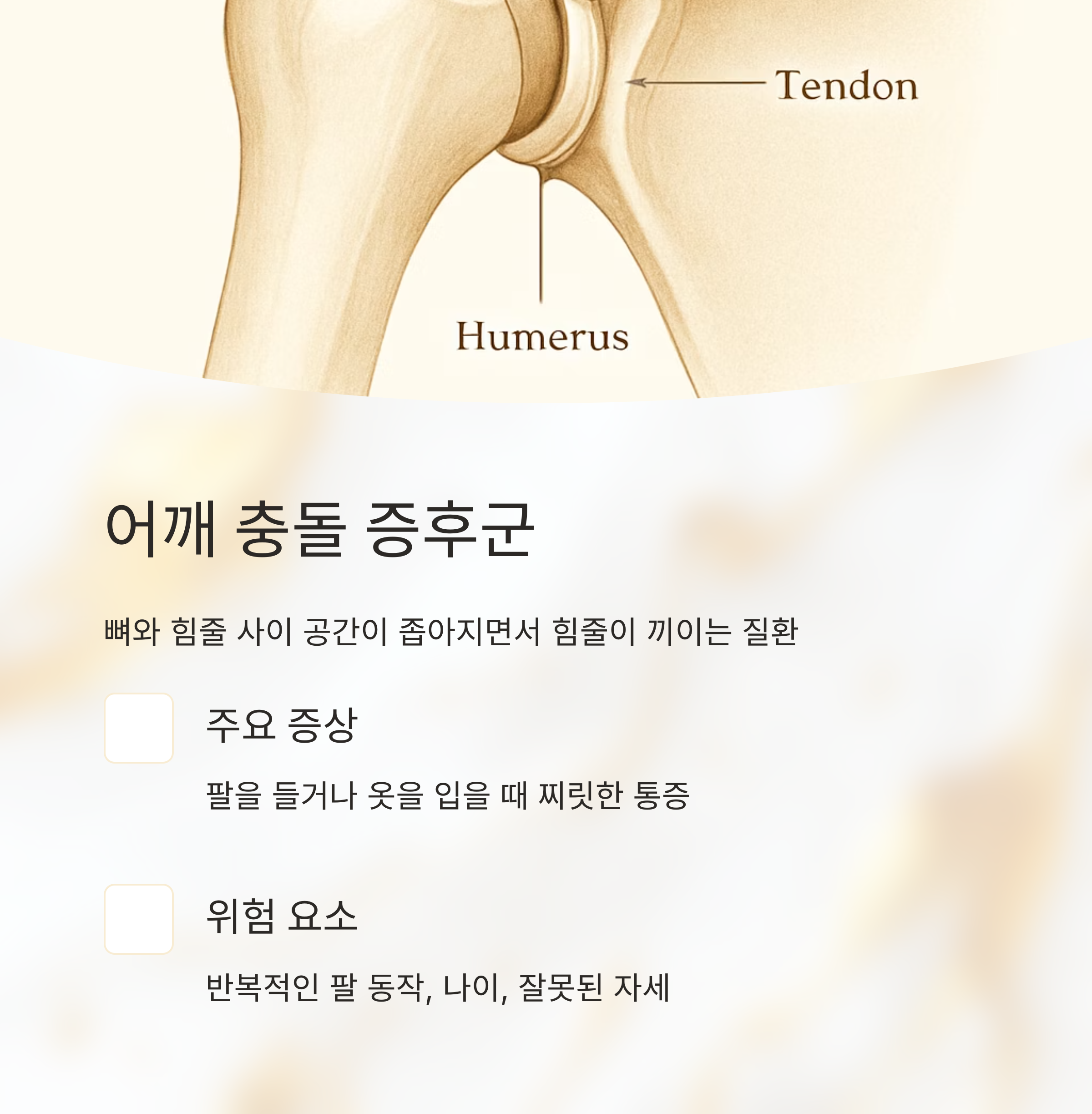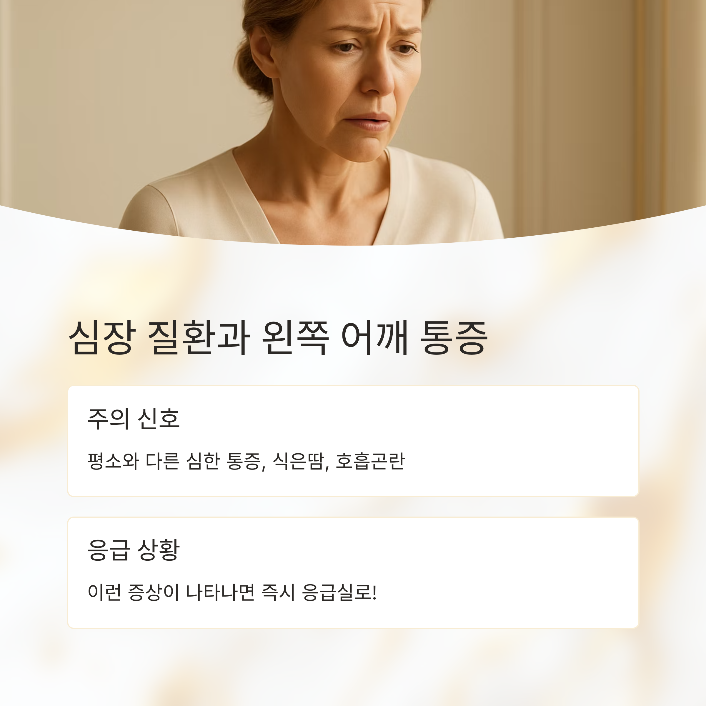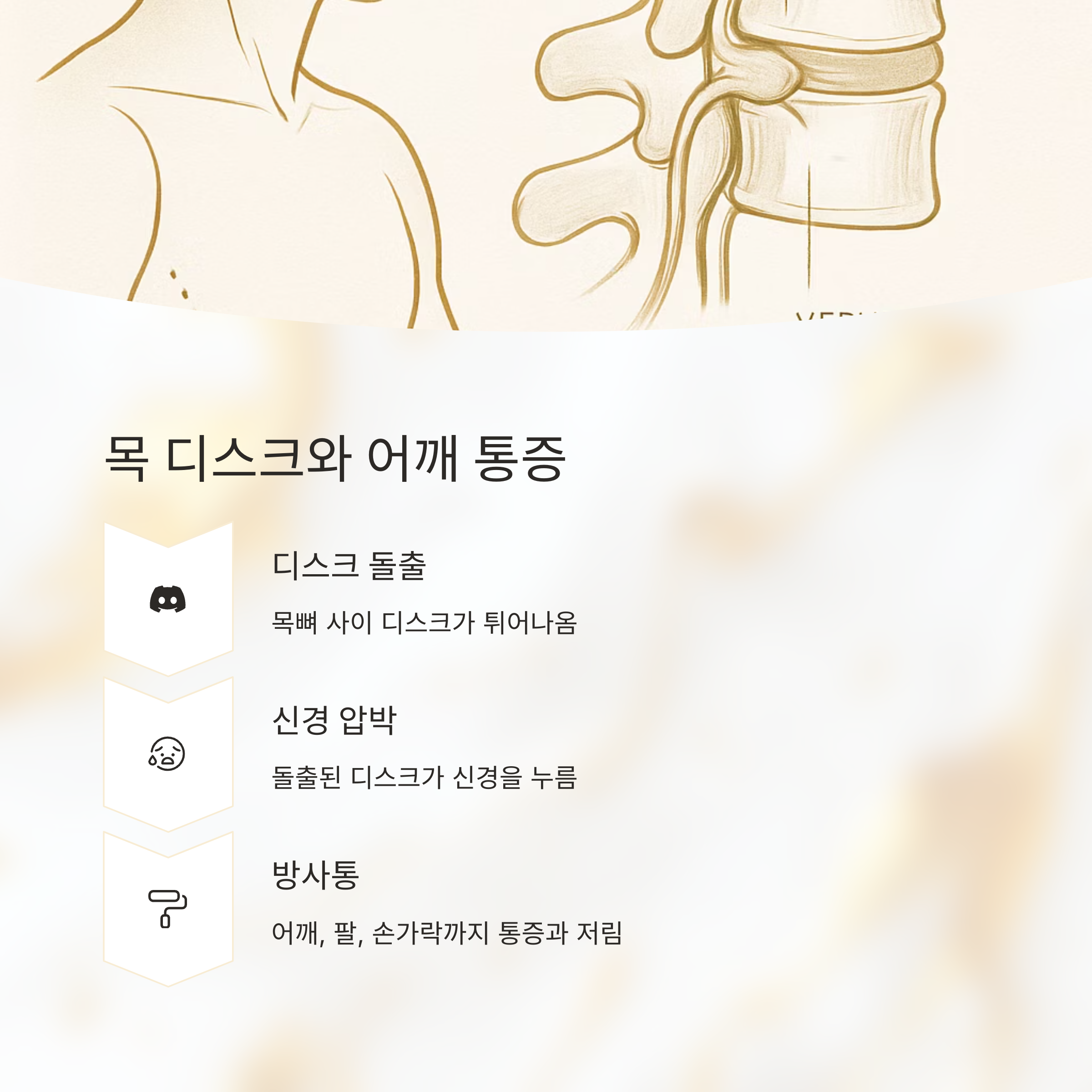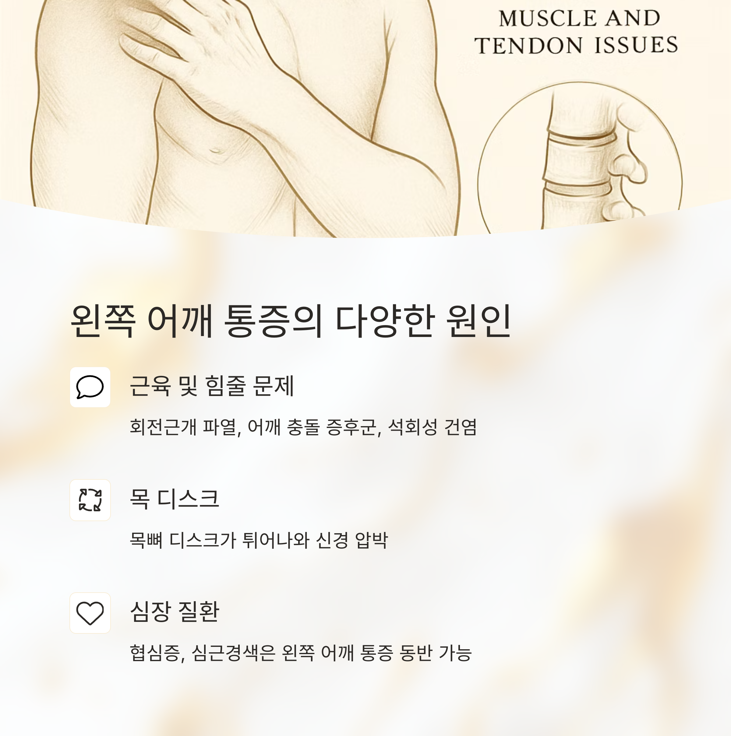 석회성 건염도 있는데, 힘줄에 칼슘이 쌓이면서 엄청난 통증을 유발하죠. 이 외에도 목 디스크 때문에 어깨 통증이 나타날 수 있어요. 목뼈 사이의 디스크가 튀어나와 신경을 누르면 어깨뿐 아니라 팔, 손가락까지 저림이나 통증이 생길 수 있답니다. 심장 질환도 의심해봐야 해요.
