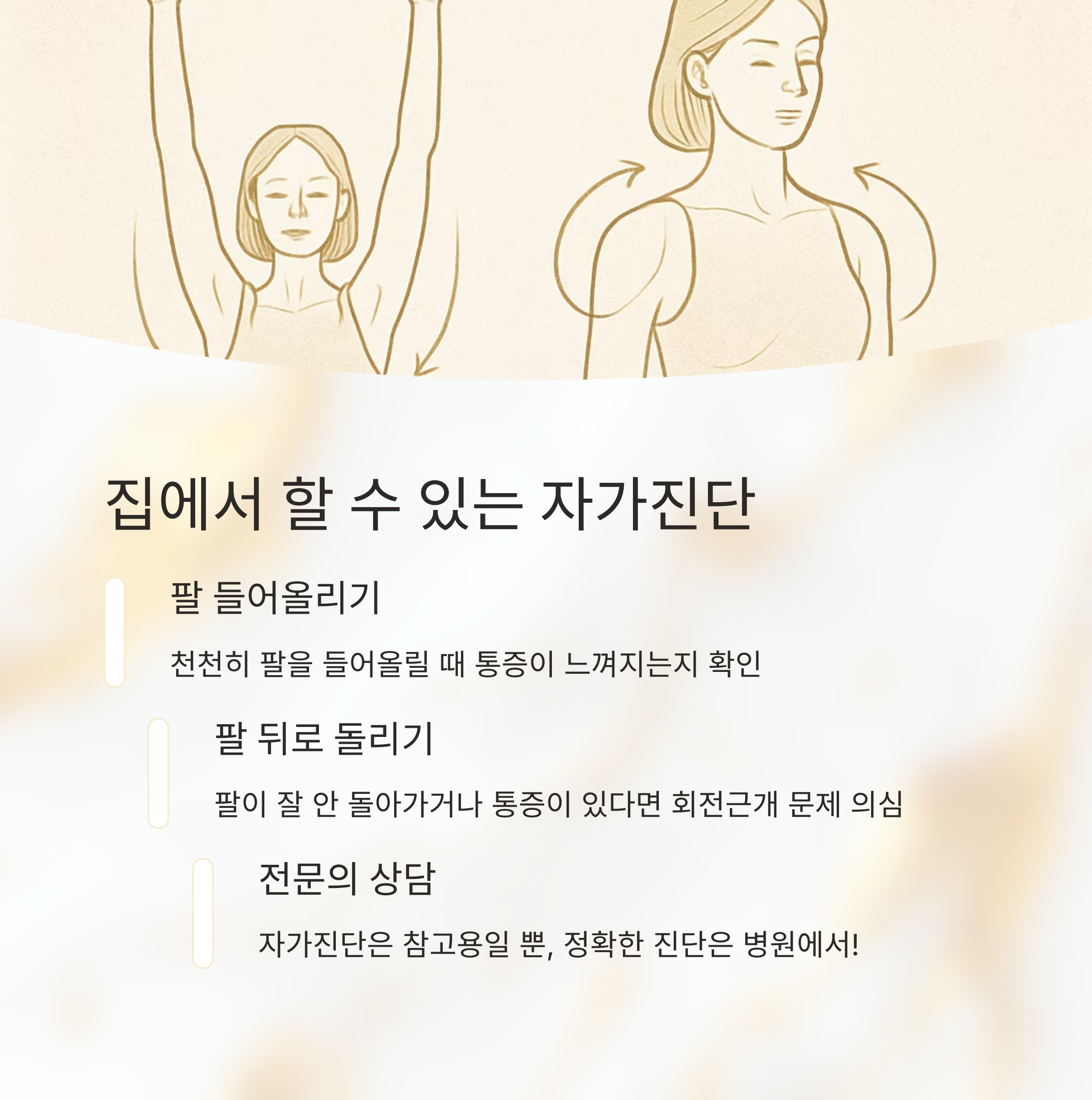 혹시 왼쪽 어깨 통증이 가볍다면, 집에서 간단한 자가진단을 해볼 수 있어요. 먼저 팔을 천천히 들어 올려보세요. 들어 올리는 동안 통증이 느껴진다면 문제가 있을 수 있어요. 다음으로 팔을 뒤로 돌려보는 건데요. 이때 팔이 잘 안 돌아가거나 통증이 느껴진다면 어깨 회전근개에 문제가 있을 가능성이 높아요.