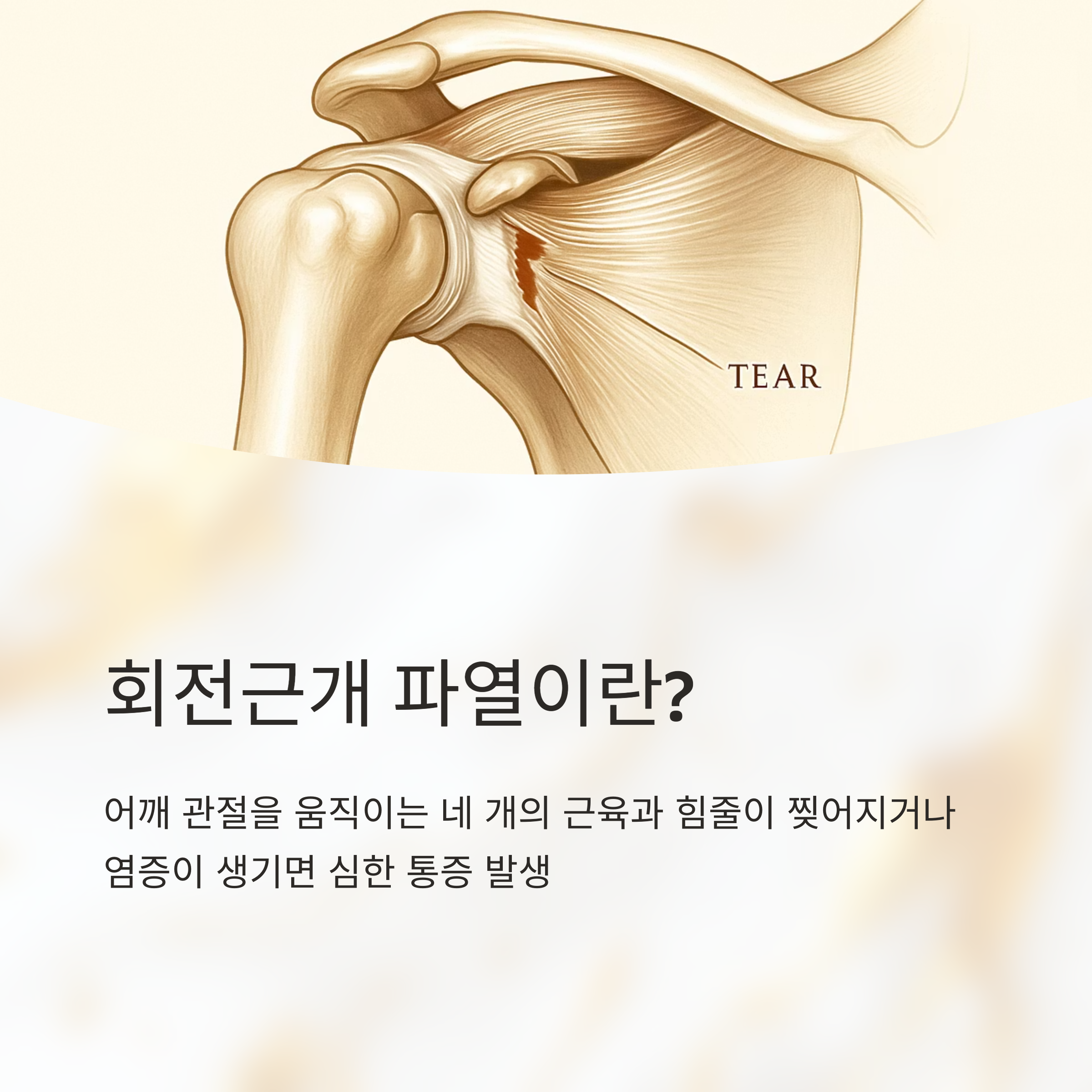 회전근개는 어깨 관절을 움직이는 네 개의 근육과 힘줄인데, 이게 찢어지거나 염증이 생기면 꽤 심한 통증이 생겨요. 특히 무거운 걸 자주 들거나 갑자기 넘어지는 등의 외상 후에 잘 나타나죠. 어깨 충돌 증후군은 뼈와 힘줄 사이 공간이 좁아지면서 힘줄이 끼이는 질환인데, 팔을 들거나 옷을 입을 때 찌릿한 통증이 느껴져요.