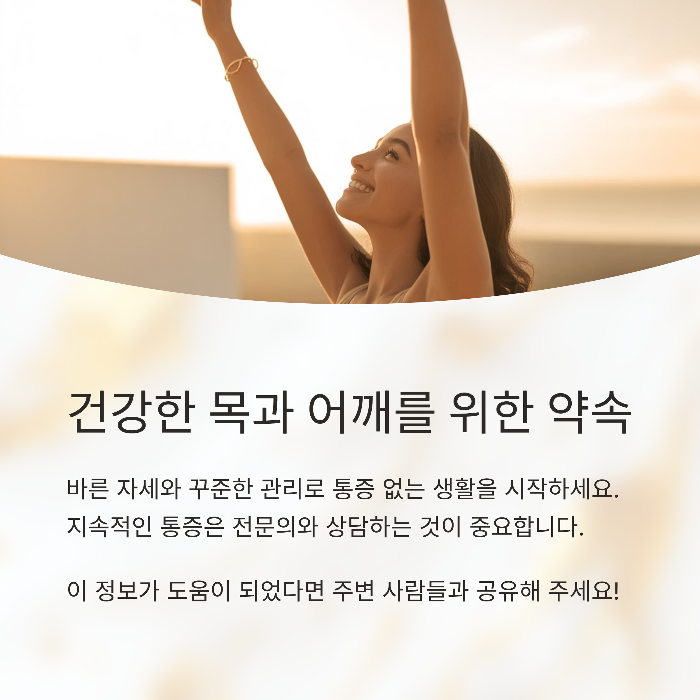 목 어깨 통증 원인은 우리의 생활 습관과 밀접한 관련이 있습니다. 오늘 알려드린 정보들이 여러분의 목과 어깨 건강에 도움이 되기를 바랍니다. 하지만 이 글은 전문적인 의학 정보를 대체할 수 없습니다. 만약 지속적인 통증을 경험한다면, 반드시 전문의와 상담하여 정확한 진단과 치료를 받으세요. 건강한 생활 습관과 꾸준한 관리를 통해 건강한 어깨와 목을 유지하시길 바랍니다. 더 궁금한 점이 있으시면 언제든지 문의해 주세요!