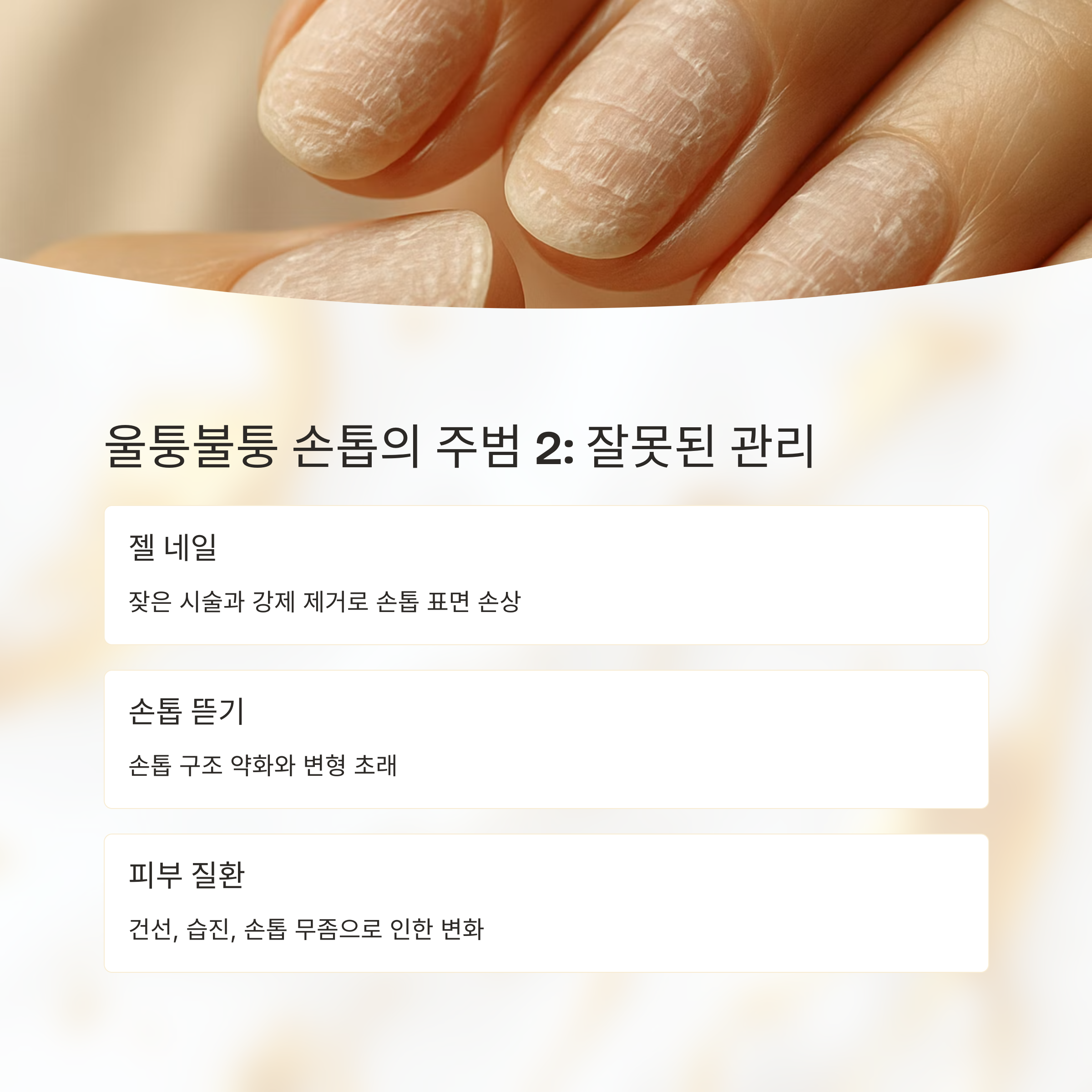 또, 잘못된 손톱 관리 습관도 문제가 될 수 있어요. 젤 네일을 자주 하거나 억지로 떼어내면 손톱 표면이 손상되어 울퉁불퉁해질 수 있죠. 저도 예전에 젤 네일을 자주 했는데 손톱이 많이 상했던 기억이 나네요. 손톱을 뜯는 습관 역시 손톱 건강에 좋지 않아요.