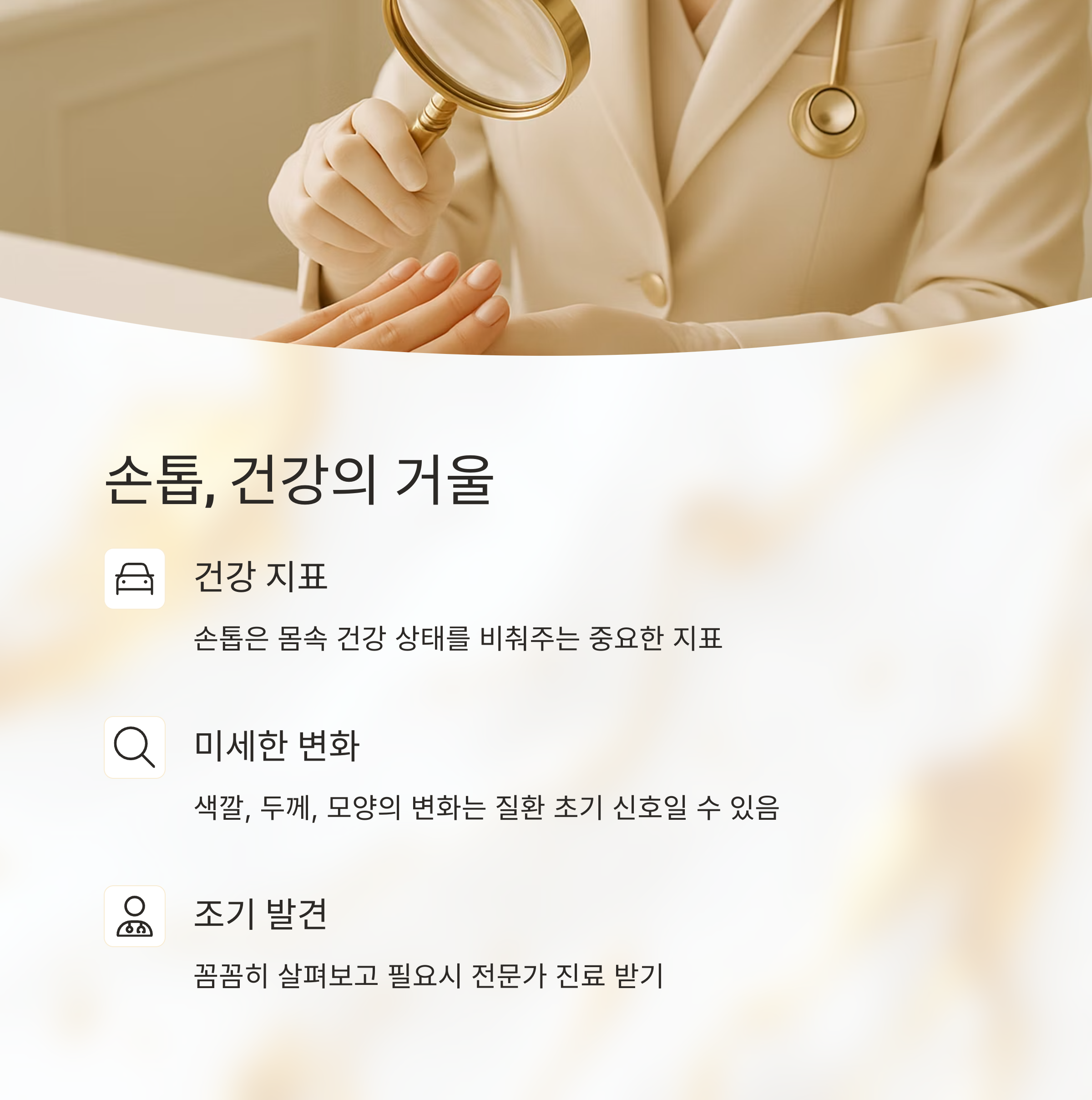 손톱은 작은 변화에도 우리 몸의 건강 상태를 알려주는 소중한 신호입니다. 평소 손톱 상태에 관심을 가지고, 이상 징후가 보이면 즉시 전문가의 도움을 받는 것이 중요합니다. 작은 관심이 건강을 지키는 첫걸음이 될 수 있다는 사실을 기억하세요. 건강한 손톱, 건강한 삶을 위해 오늘부터 작은 노력을 시작해 보세요!