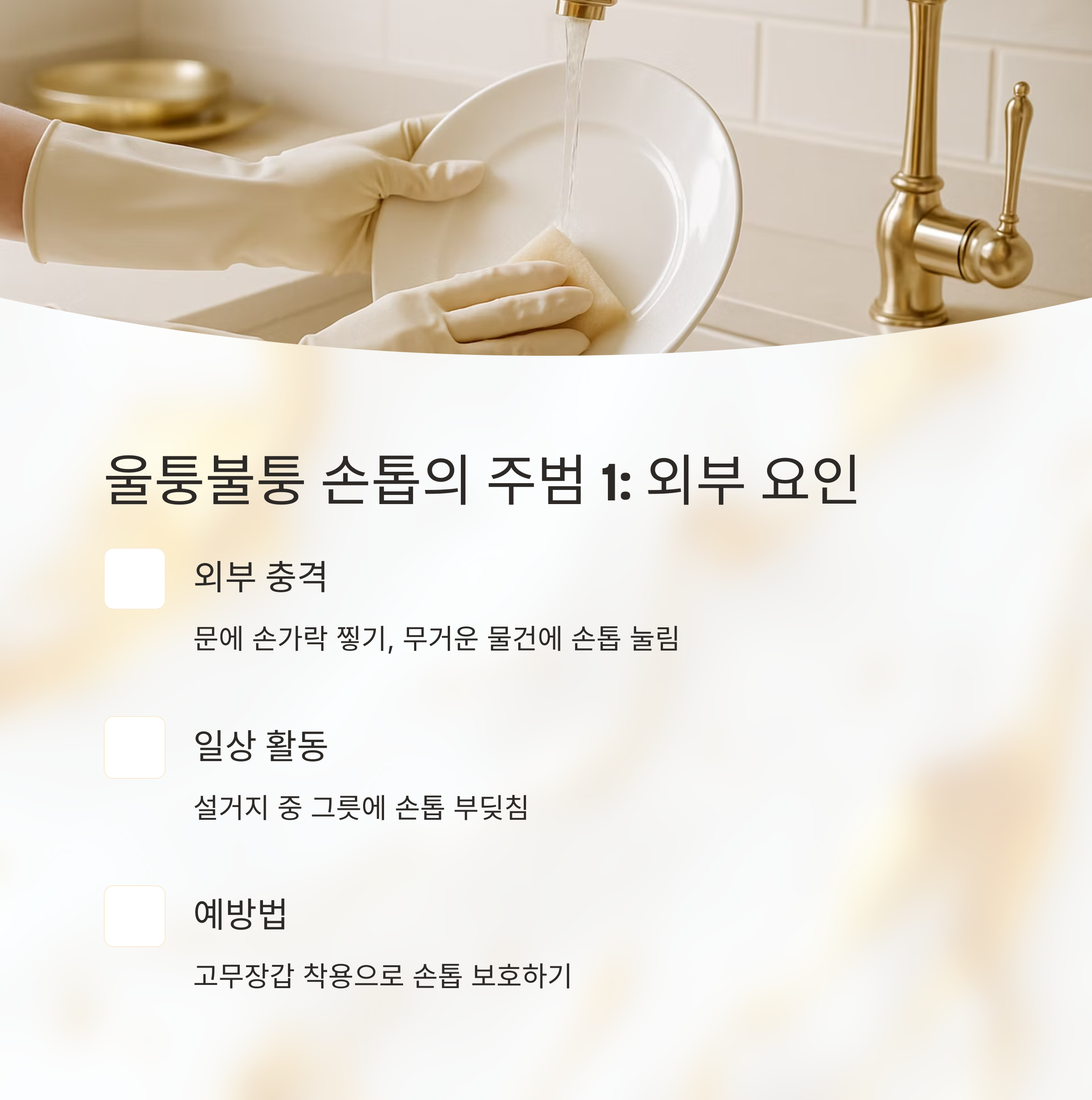 손톱이 울퉁불퉁의 원인은 다양해요. 가장 흔한 원인은 외부 충격이에요. 문에 손가락을 찧거나, 무거운 물건을 들다가 손톱이 눌리면 손톱 표면에 미세한 손상이 생겨 울퉁불퉁해질 수 있죠. 저는 설거지를 하다가 그릇에 손톱을 자주 부딪쳐서 고생했어요. 그래서 요즘은 꼭 고무장갑을 끼고 설거지를 한답니다.