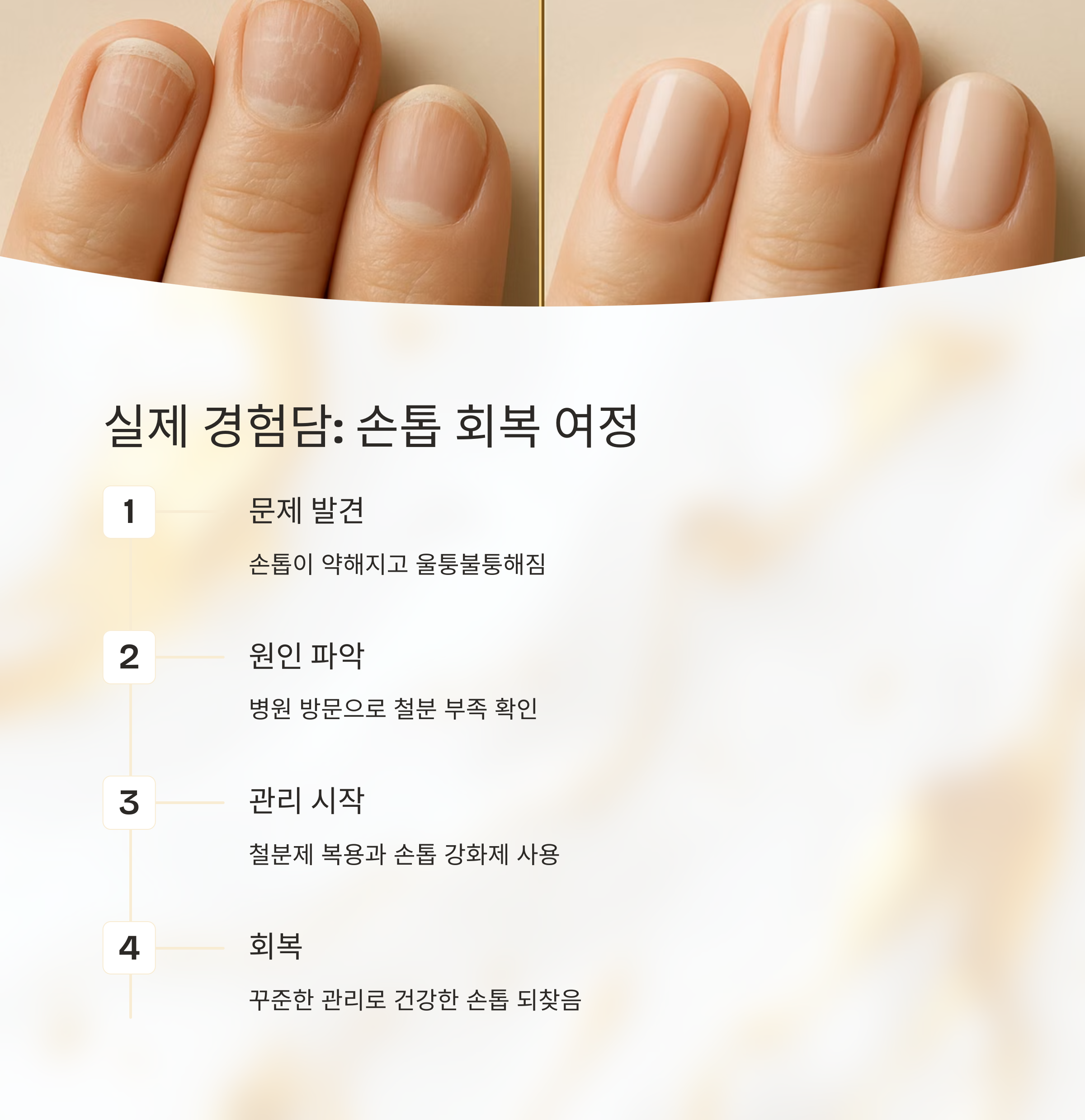 손톱을 너무 짧게 깎지 않고, 손톱을 물어뜯는 습관은 고치는 것이 중요하고요. 저는 손톱이 약해졌을 때 철분제를 복용하고 철분이 풍부한 음식을 꾸준히 섭취했어요. 그리고 손톱 강화제를 발라 손톱을 보호했죠. 꾸준한 관리를 통해 건강하고 아름다운 손톱을 유지할 수 있답니다. 손톱 건강은 단순히 미용적인 문제가 아니라, 우리 건강과 직결된다는 사실을 잊지 마세요.