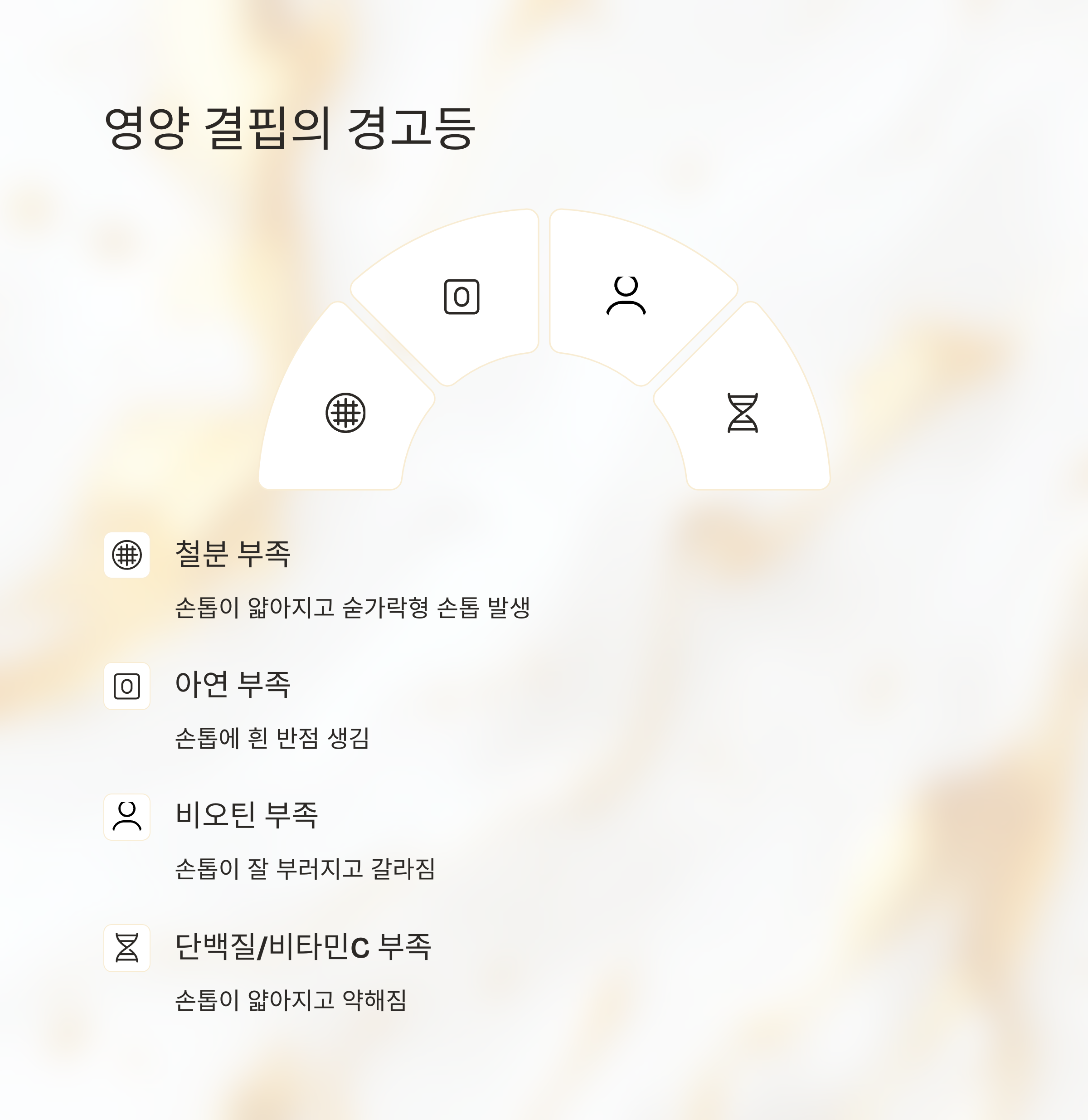 손톱은 영양 결핍을 알려주는 신호등이기도 해요. 철분, 아연, 비오틴, 단백질, 비타민C 등이 부족하면 손톱에 다양한 변화가 나타날 수 있습니다. 철분이 부족하면 손톱이 얇아지고 가운데가 움푹 들어가는 숟가락형 손톱이 될 수 있어요. 아연이 부족하면 손톱에 흰 반점이 생기고, 비오틴이 부족하면 손톱이 잘 부러지고 갈라져요.