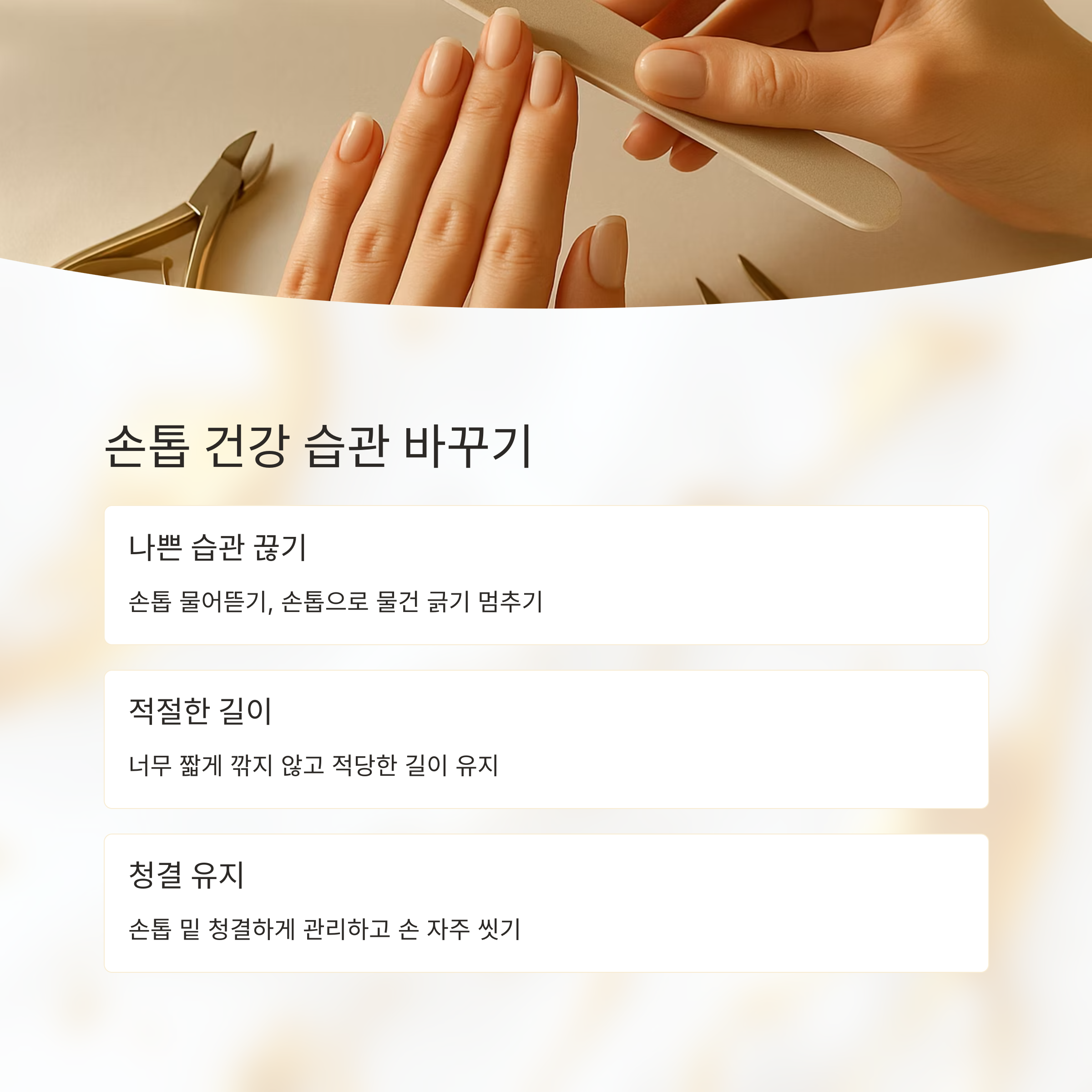 손톱 건강을 위해서는 균형 잡힌 식단과 충분한 수분 섭취가 필수입니다. 철분, 아연, 비오틴이 풍부한 음식을 섭취하고, 손톱을 외부 충격으로부터 보호하며, 젤 네일이나 인조 손톱 사용을 줄이고, 손톱을 깨끗하게 유지해야 해요. 손톱 주변에 보습제를 발라주는 것도 좋은 방법입니다.