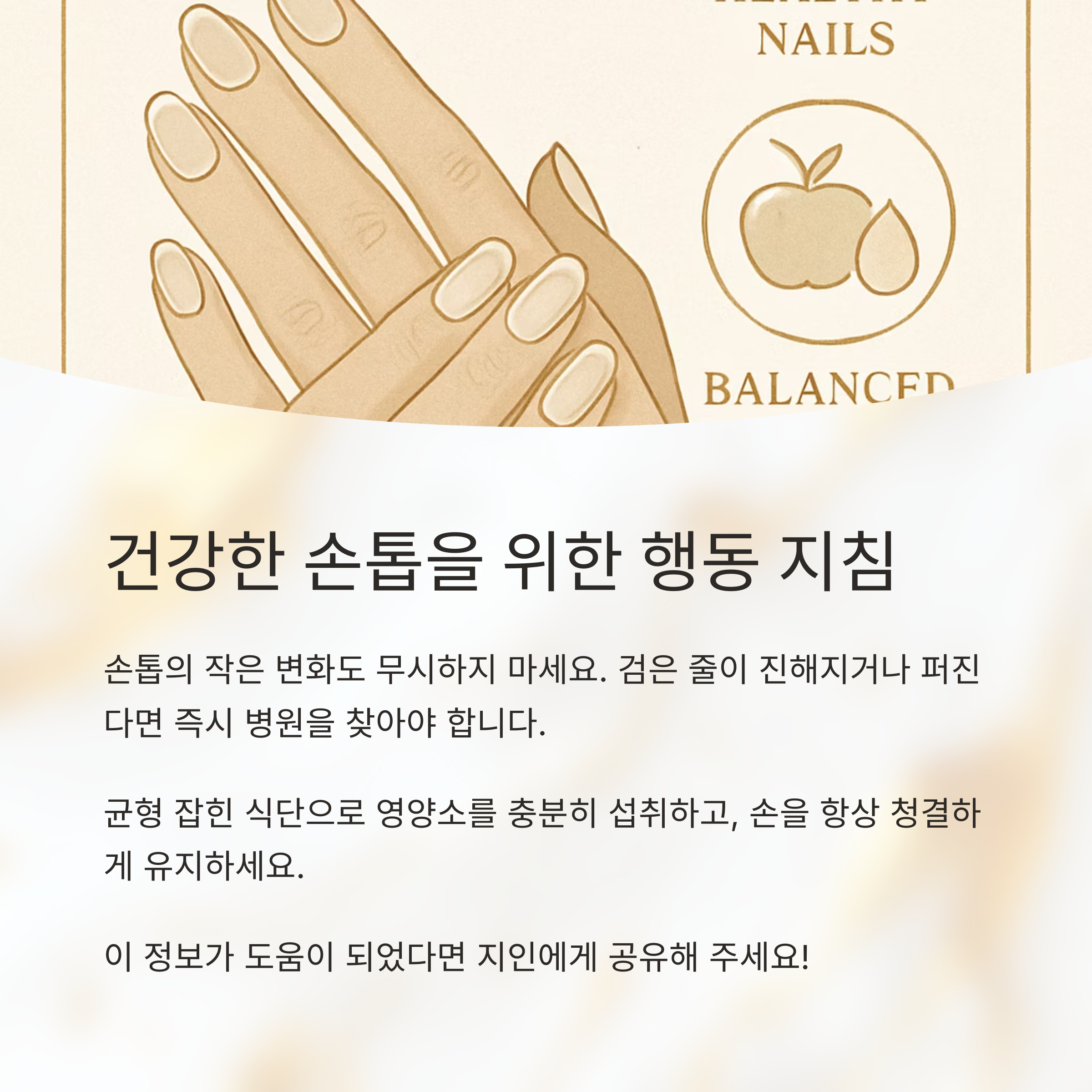 손톱에 나타나는 검은 줄은 다양한 이유로 생길 수 있지만, 무엇보다 중요한 것은 그냥 넘기지 않고 관찰하고 적절한 대처를 하는 것입니다. 작은 변화가 큰 문제로 이어지기 전에 미리 대비하는 것이 건강을 지키는 가장 현명한 방법입니다. 오늘 알려드린 정보가 여러분의 건강에 도움이 되기를 바랍니다. 건강한 손톱, 건강한 삶을 위해 오늘부터 꼼꼼히 살펴보세요!
