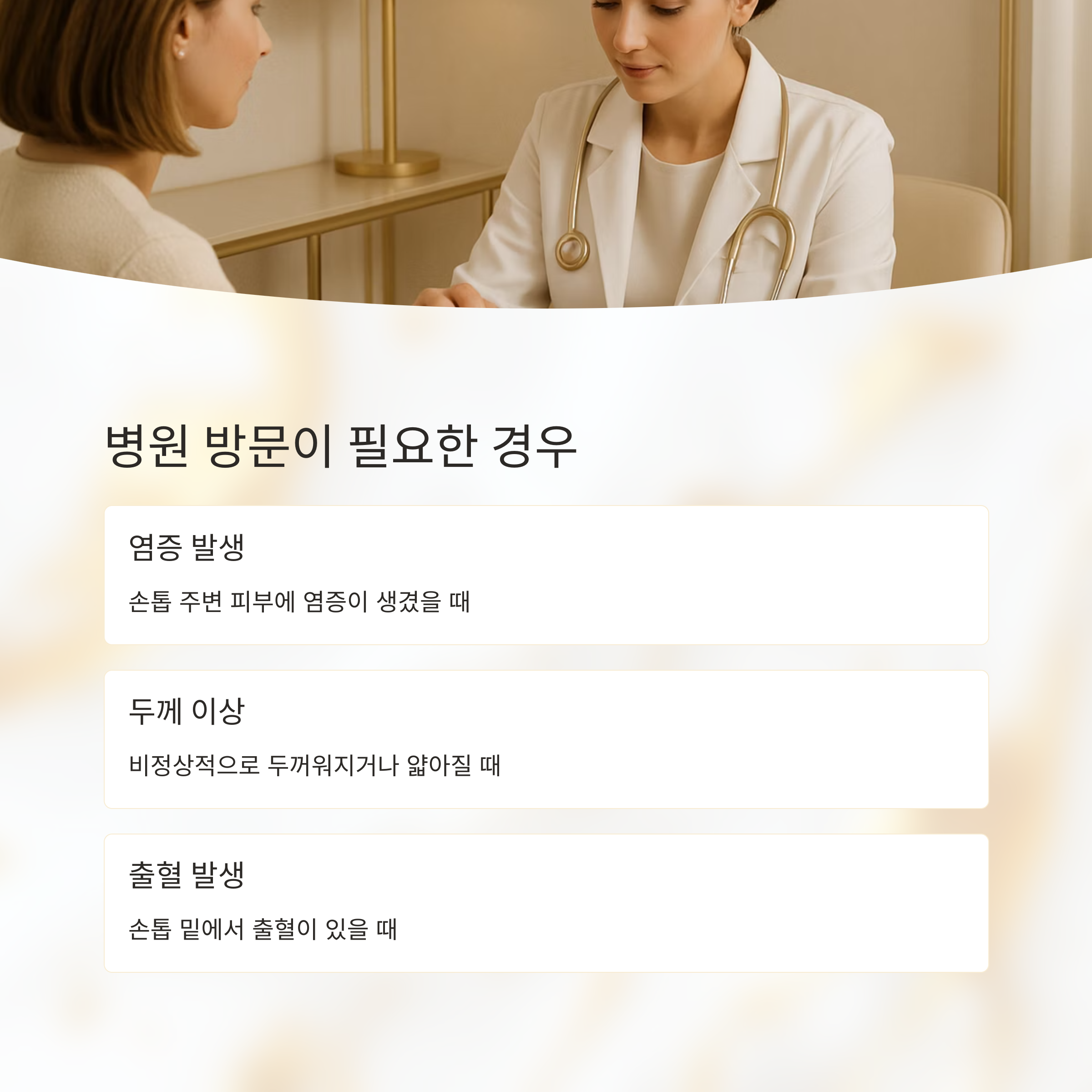 자가 관리에도 불구하고 손톱 갈라짐이 계속되거나 더 심해진다면, 전문가의 도움을 받는 것이 좋습니다. 특히 손톱 주변 피부에 염증이 생기거나 손톱이 비정상적으로 두꺼워지거나 얇아지는 경우, 손톱 밑에서 출혈이 있는 경우는 꼭 병원에 방문하셔야 해요. 전문의는 손톱 갈라짐의 원인을 정확하게 진단하고, 필요한 치료법을 제시해 줄 수 있답니다.