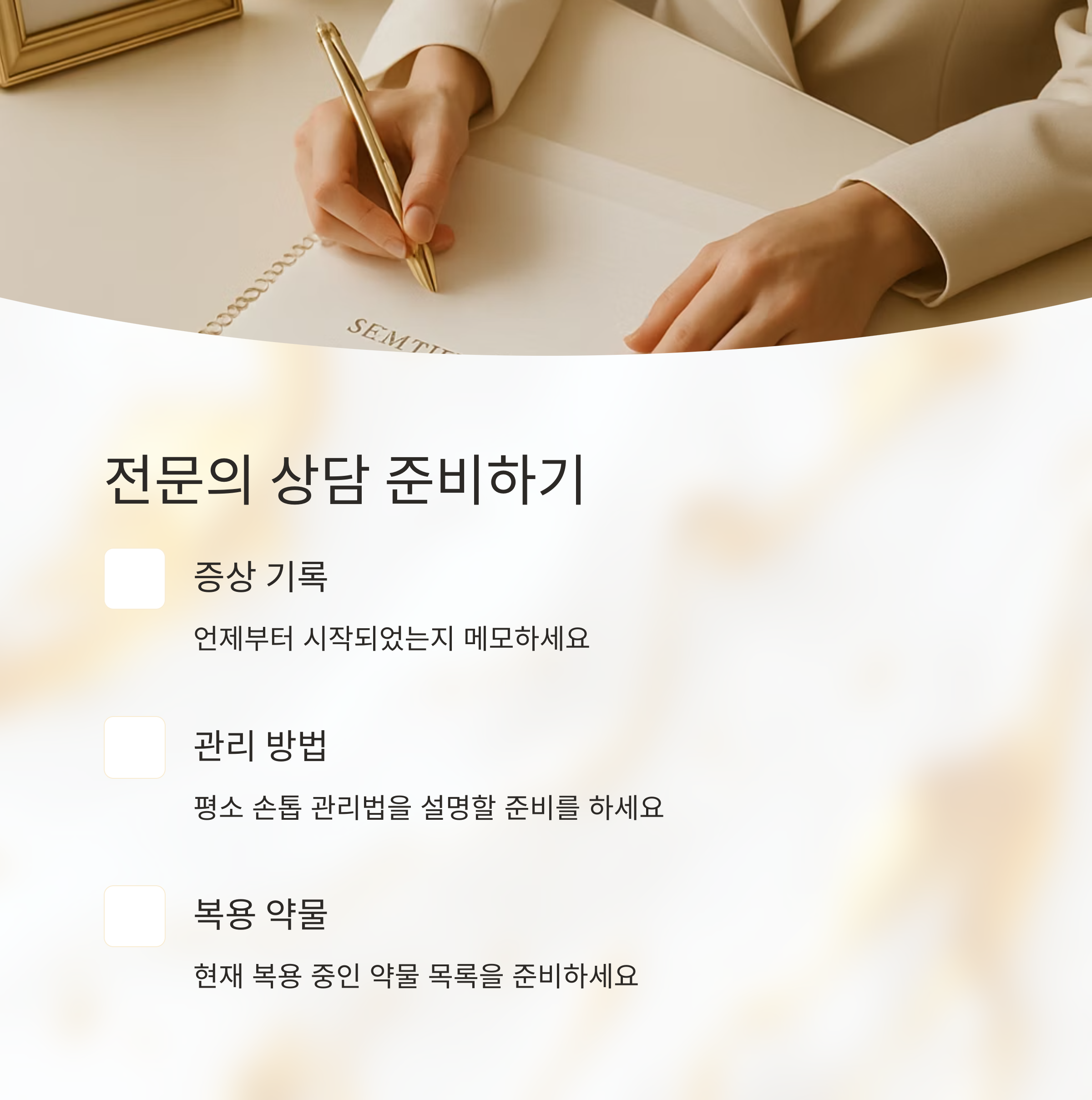 영양제 처방이나 피부 질환 치료 등 다양한 방법으로 도움을 받을 수 있고, 혹시 모를 심각한 질병의 조기 발견에도 도움이 될 수 있으니 안심하고 상담받아 보세요. 병원에 가기 전에는 증상이 언제부터 시작되었는지, 평소 손톱 관리 방법은 어떤지, 현재 복용 중인 약물이 있는지 등을 미리 메모해두면 도움이 된답니다. 빠른 진단과 치료가 중요하다는 사실을 잊지 마세요!