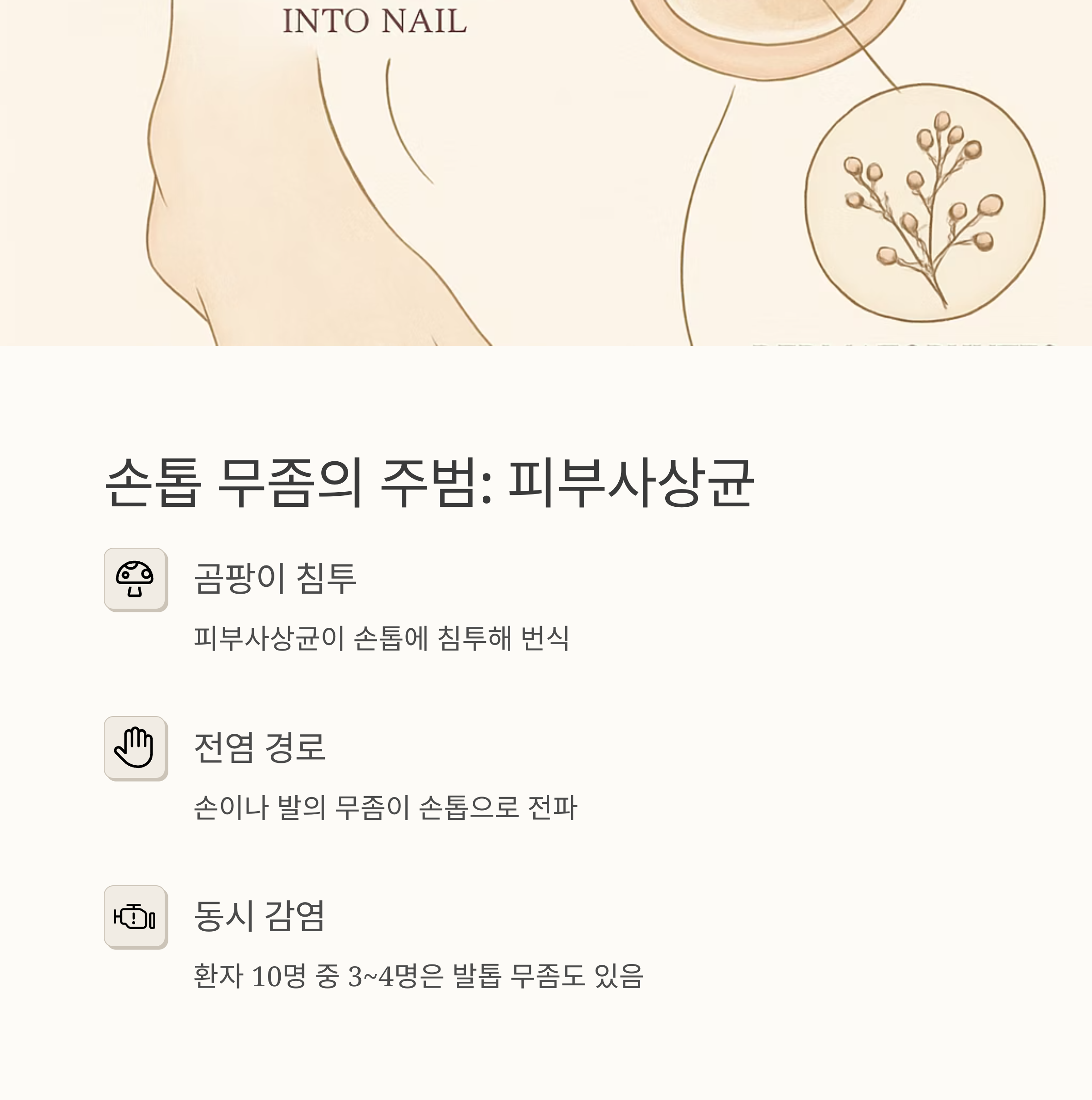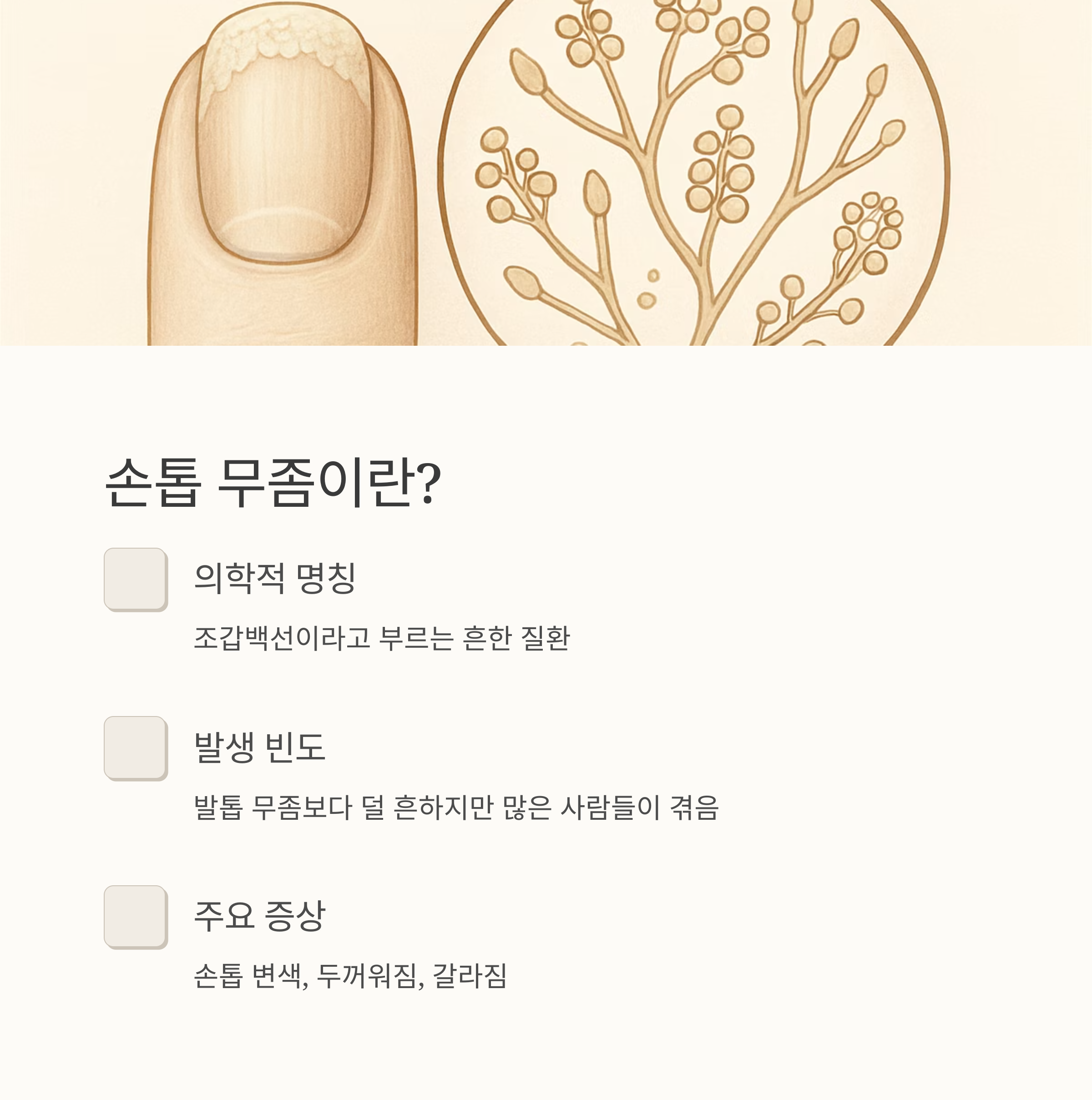 손톱 무좀은 의학적으로 '조갑백선'이라고 부르는 질환인데요, 발톱 무좀보다는 흔하지 않지만, 생각보다 많은 분들이 겪고 있는 흔한 질환입니다. 오늘은 손톱 무좀이 왜 생기는지, 어떻게 예방하고 관리해야 하는지 자세하게 알려드릴게요. 손톱 건강, 함께 꼼꼼히 챙겨봐요!