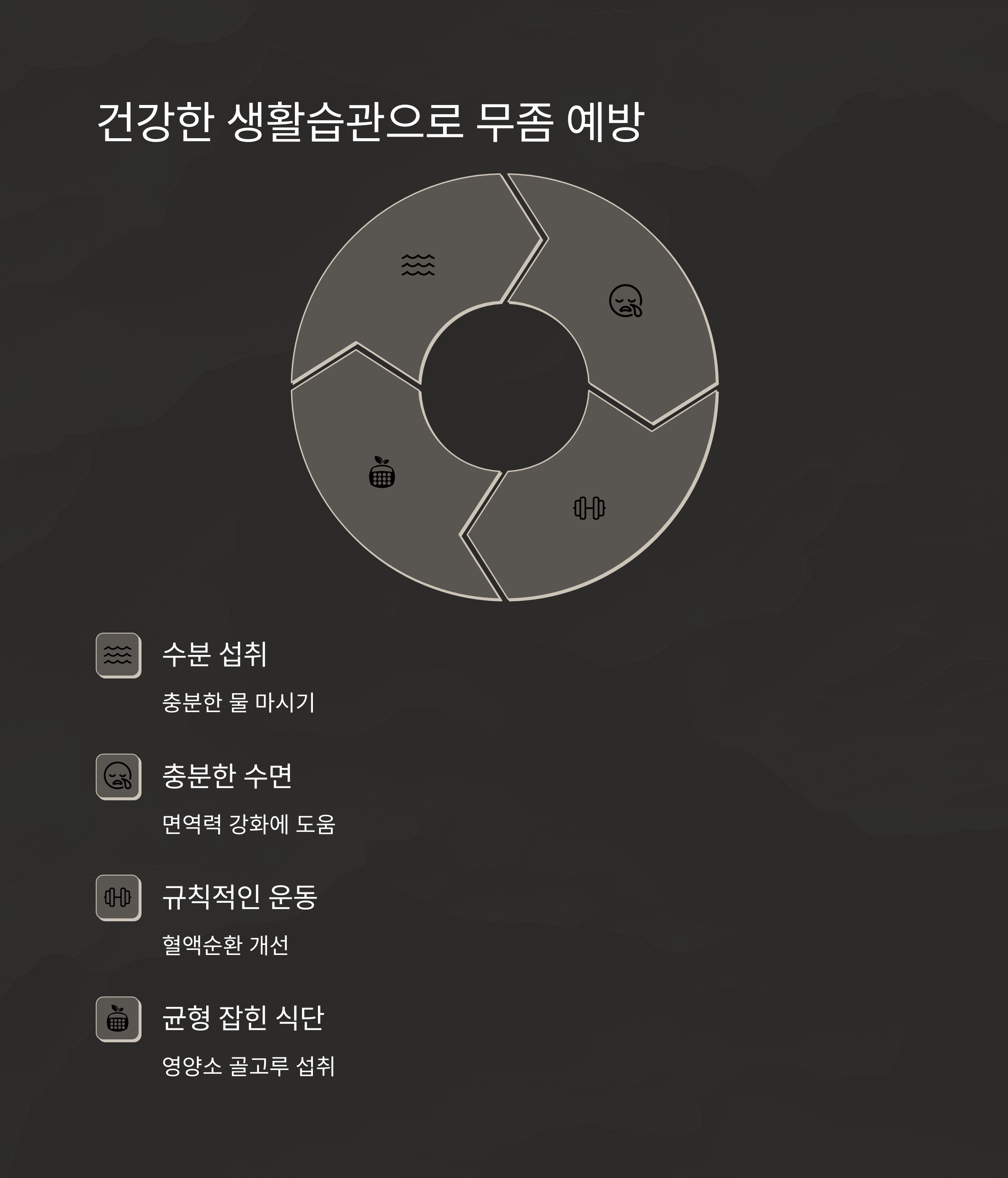 면역력이 약해지면 무좀에 걸릴 확률이 높아집니다. 당뇨병이나 고혈압 같은 만성질환이 있거나, 암 치료 중이거나 면역억제제를 복용 중인 경우 특히 조심해야 해요. 나이가 들면 손발톱 성장 속도가 느려지고 자가 회복력도 떨어져서 감염에 취약해지기도 합니다. 건강한 몸과 튼튼한 면역력, 무좀 예방에 필수적인 요소입니다. 평소 건강 관리를 소홀히 하지 않는 것이 중요하겠죠.