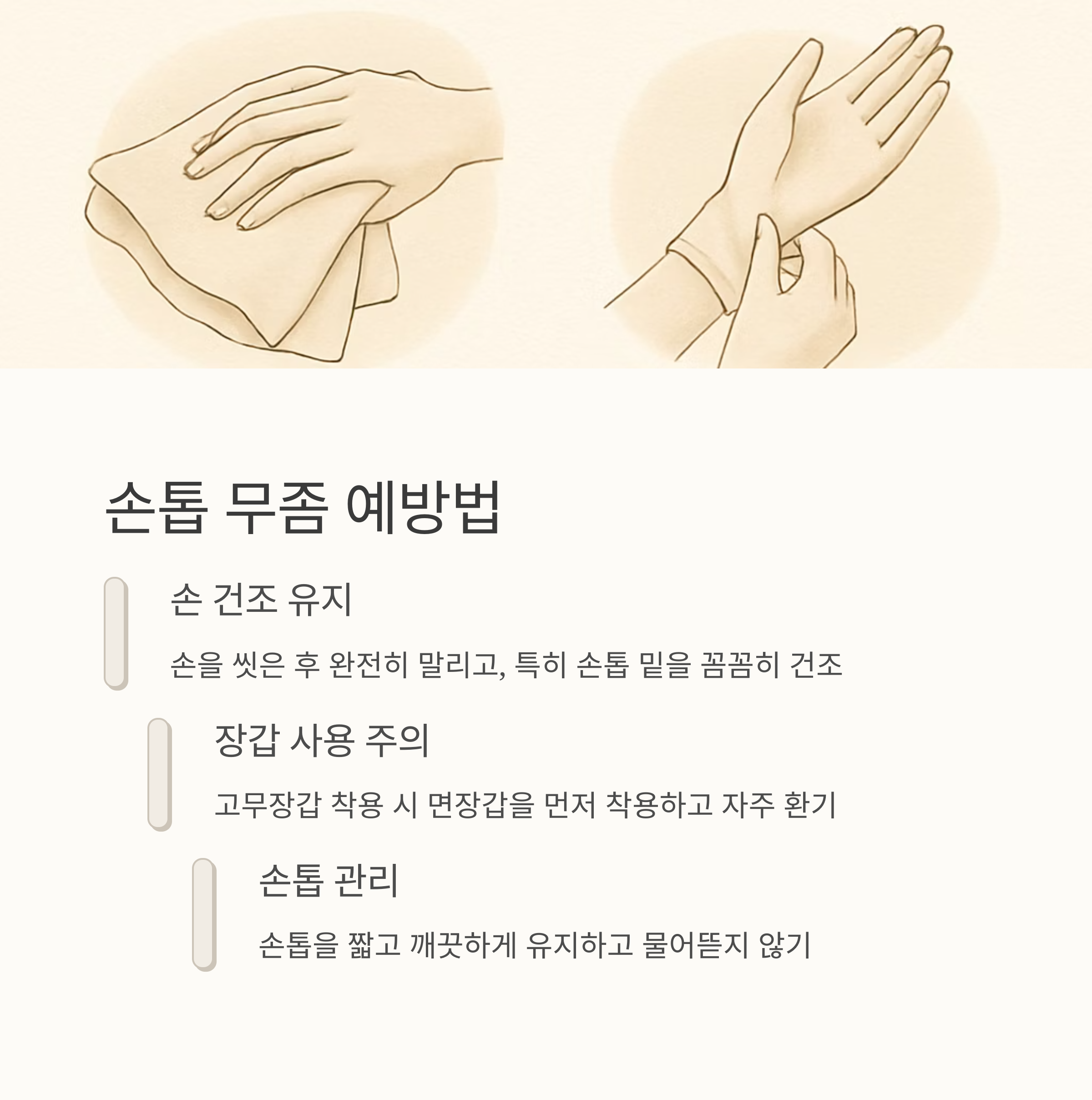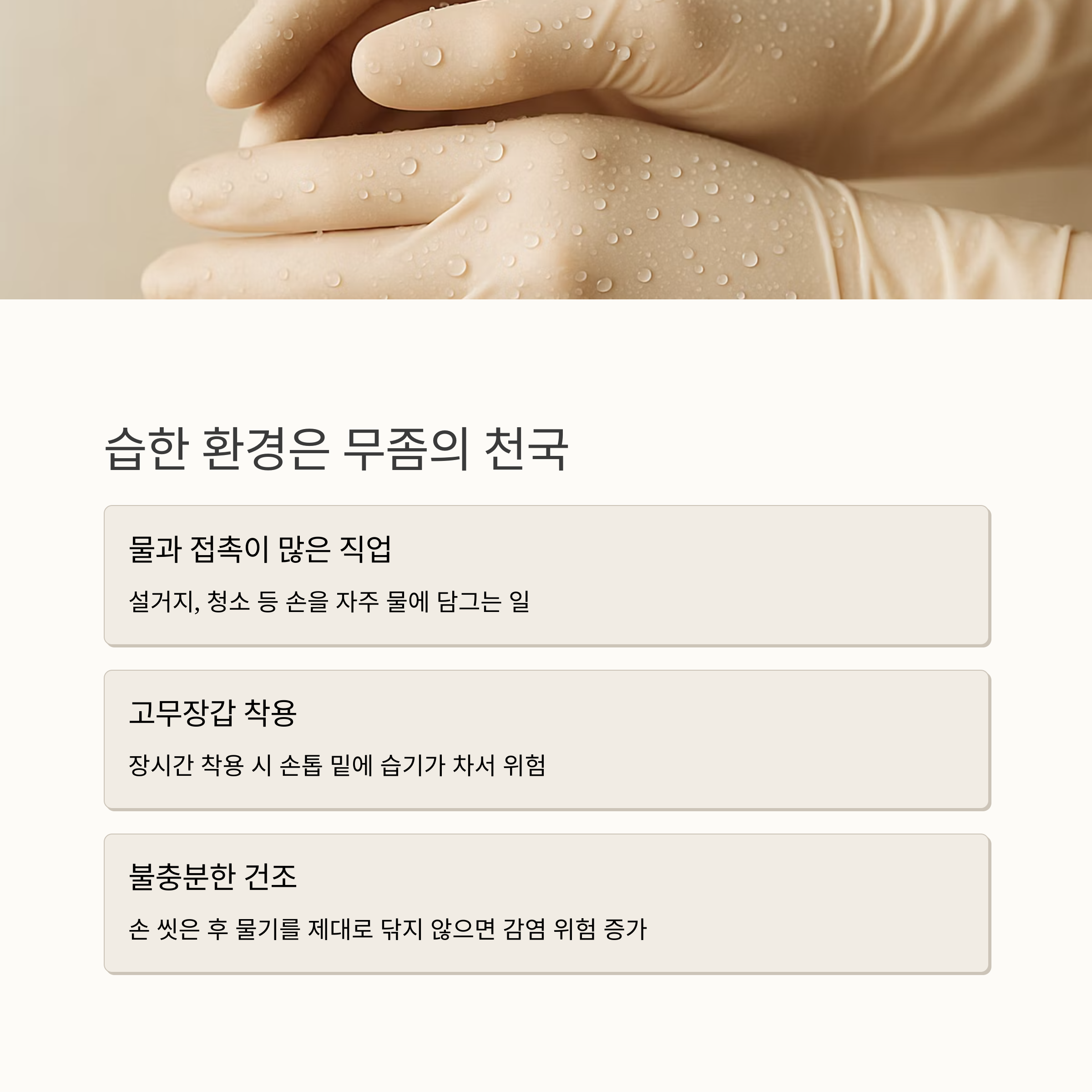 손톱 무좀은 습한 환경을 정말 좋아해요. 손을 자주 물에 담그는 직업, 예를 들어 설거지나 청소를 많이 하는 경우, 혹은 고무장갑을 오래 착용하는 경우에는 손톱 밑에 습기가 차서 곰팡이가 번식하기 쉽습니다. 손톱을 물어뜯는 습관도 위험해요.