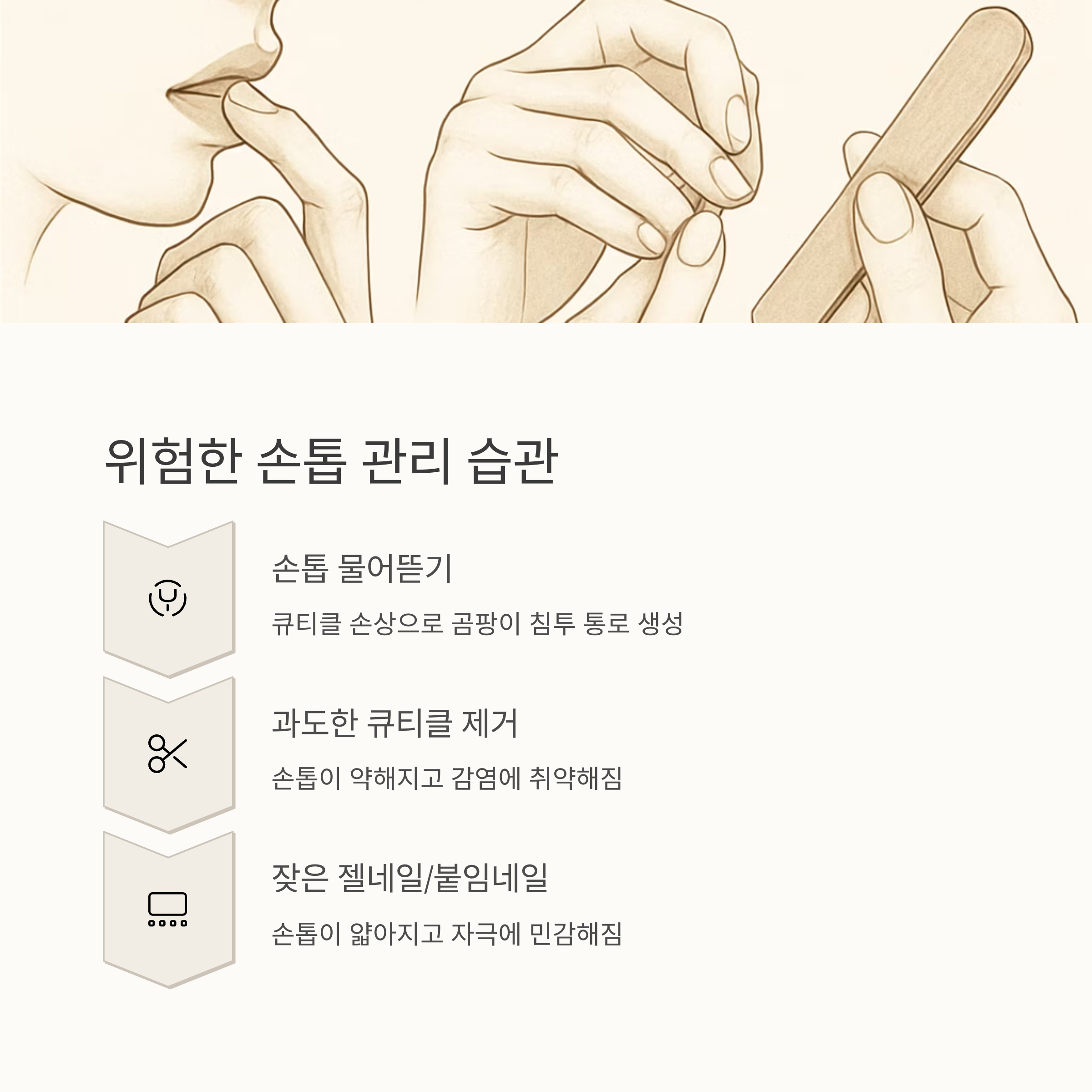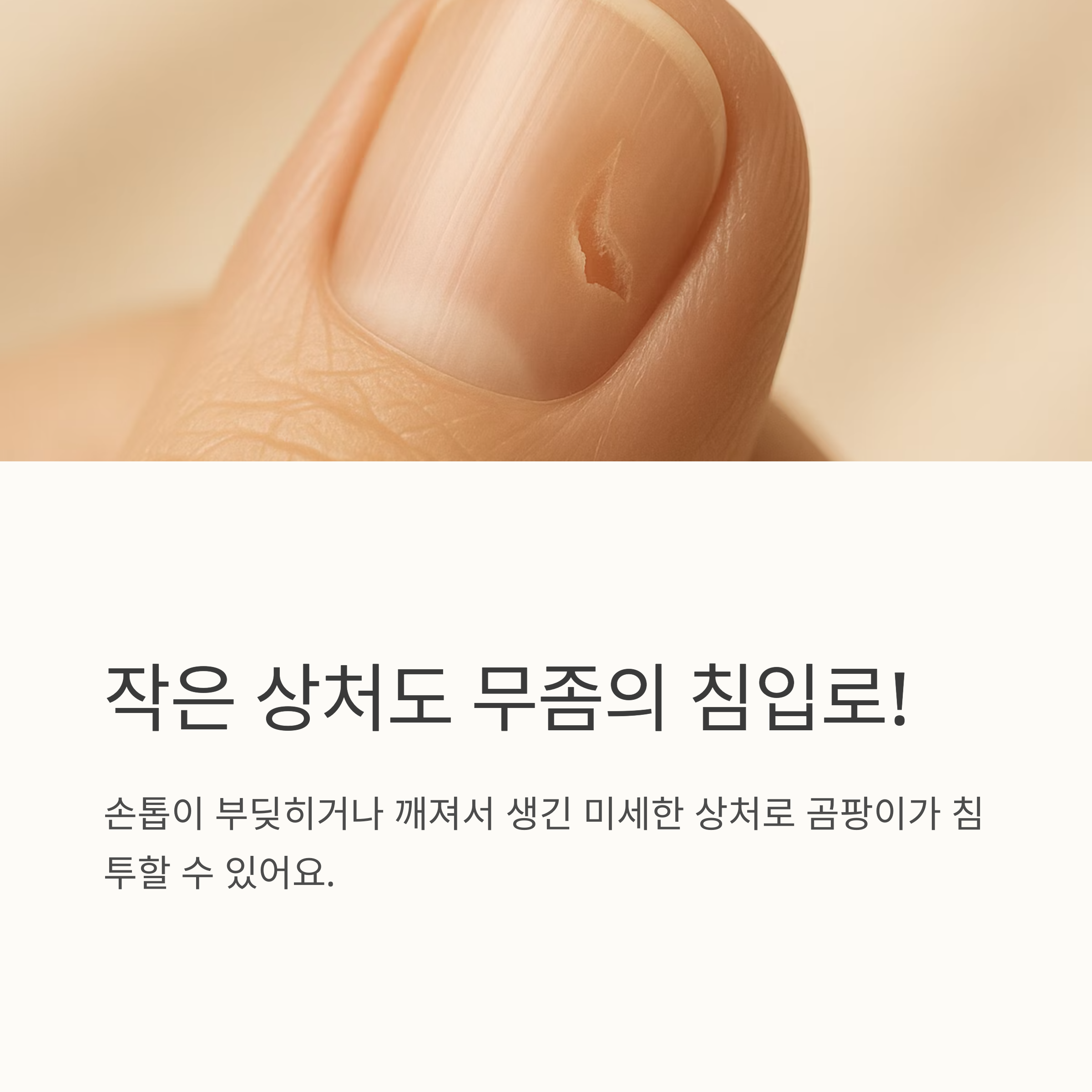 손톱이 부딪히거나 깨져서 미세한 상처가 생기면, 그 틈으로 곰팡이가 침투할 수 있습니다. 손톱을 자주 다듬는 습관, 특히 큐티클을 과도하게 제거하면 손톱이 약해지고 감염에 더욱 취약해져요.