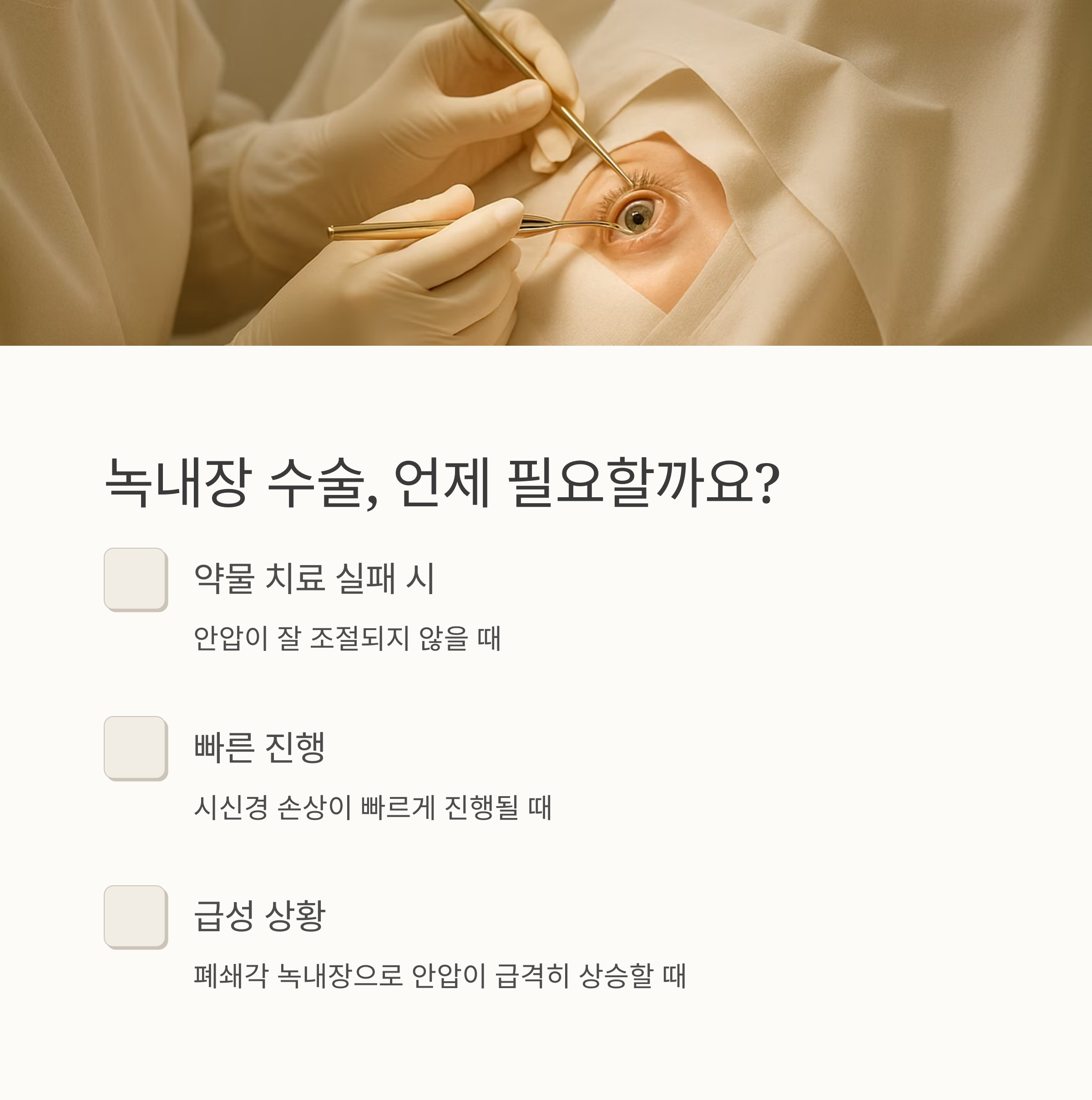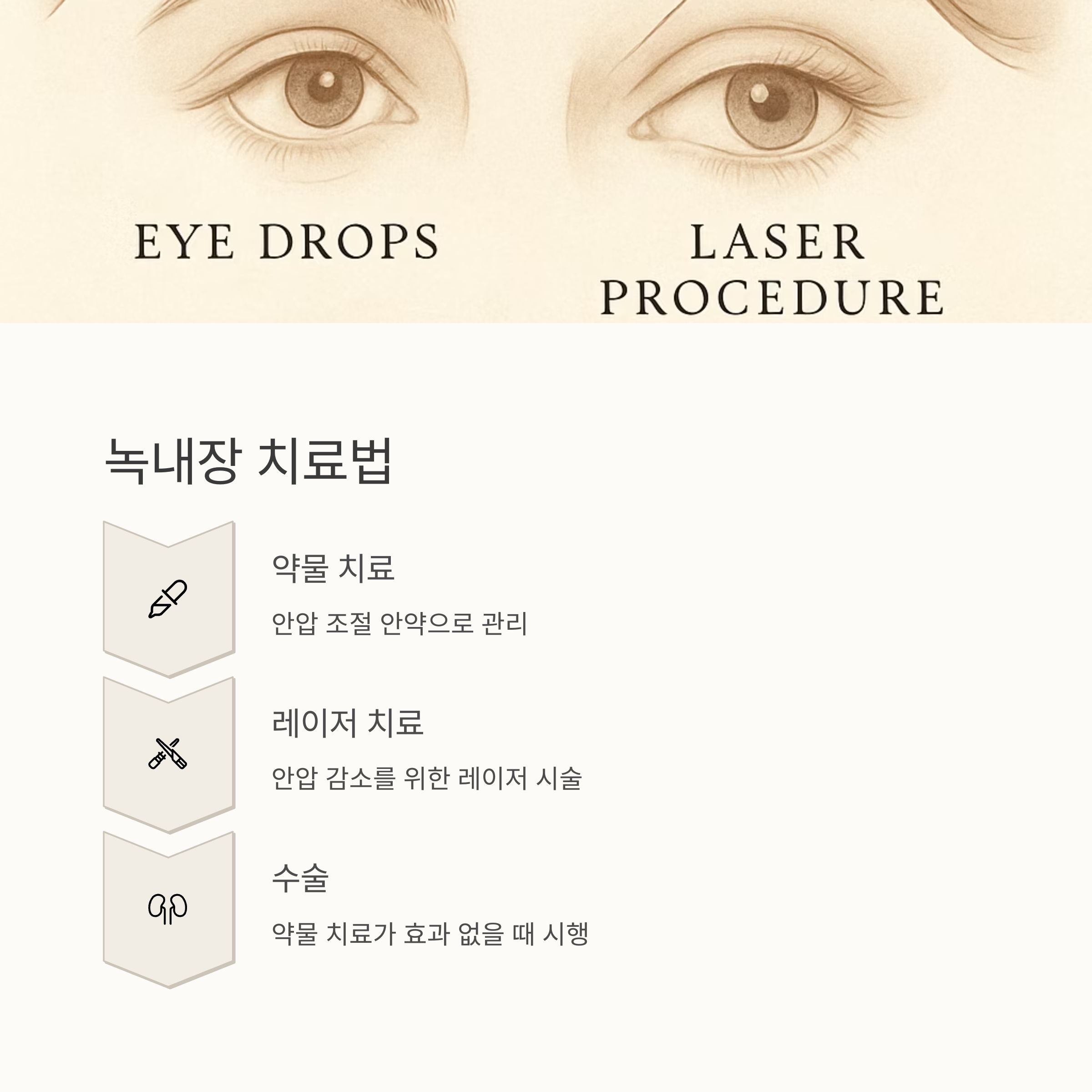녹내장은 대부분 안약이나 레이저 치료로 관리가 가능해요. 하지만 약물 치료에도 안압이 잘 조절되지 않거나, 시신경 손상이 빠르게 진행될 때, 폐쇄각 녹내장으로 갑자기 안압이 매우 높아졌을 때는 수술이 필요할 수 있어요.
