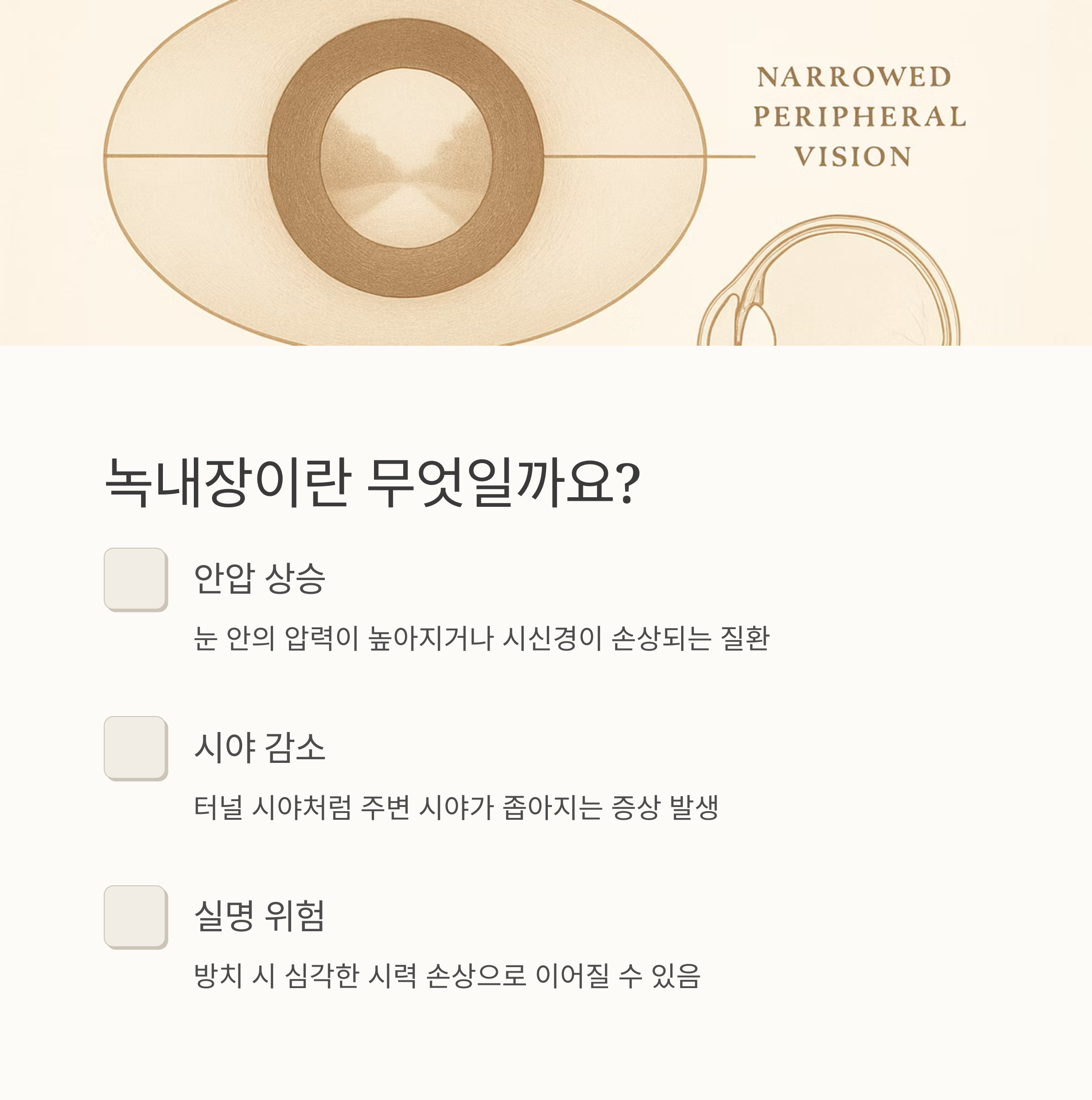 눈 건강, 괜찮으신가요? 소중한 시력을 위협하는 녹내장에 대해 속 시원히 알려드릴게요. 초기 증상부터 예방법, 관리법까지 꼼꼼하게 준비했으니, 편안한 마음으로 읽어보세요. 함께 건강한 눈, 지켜봐요!