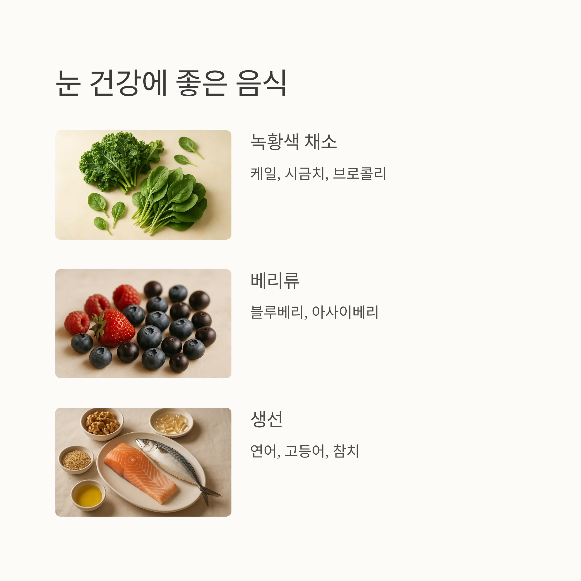 녹내장 예방과 관리에 도움이 되는 음식들도 있어요. 녹황색 채소(케일, 시금치, 브로콜리), 베리류(블루베리, 아사이베리), 견과류와 씨앗류(아몬드, 호두, 치아씨드), 생선(연어, 고등어, 참치), 당근 등이 눈 건강에 좋은 영향을 준답니다. 특히 루테인이 풍부한 음식들이 눈 건강에 도움이 된다는 연구결과들이 많아요.