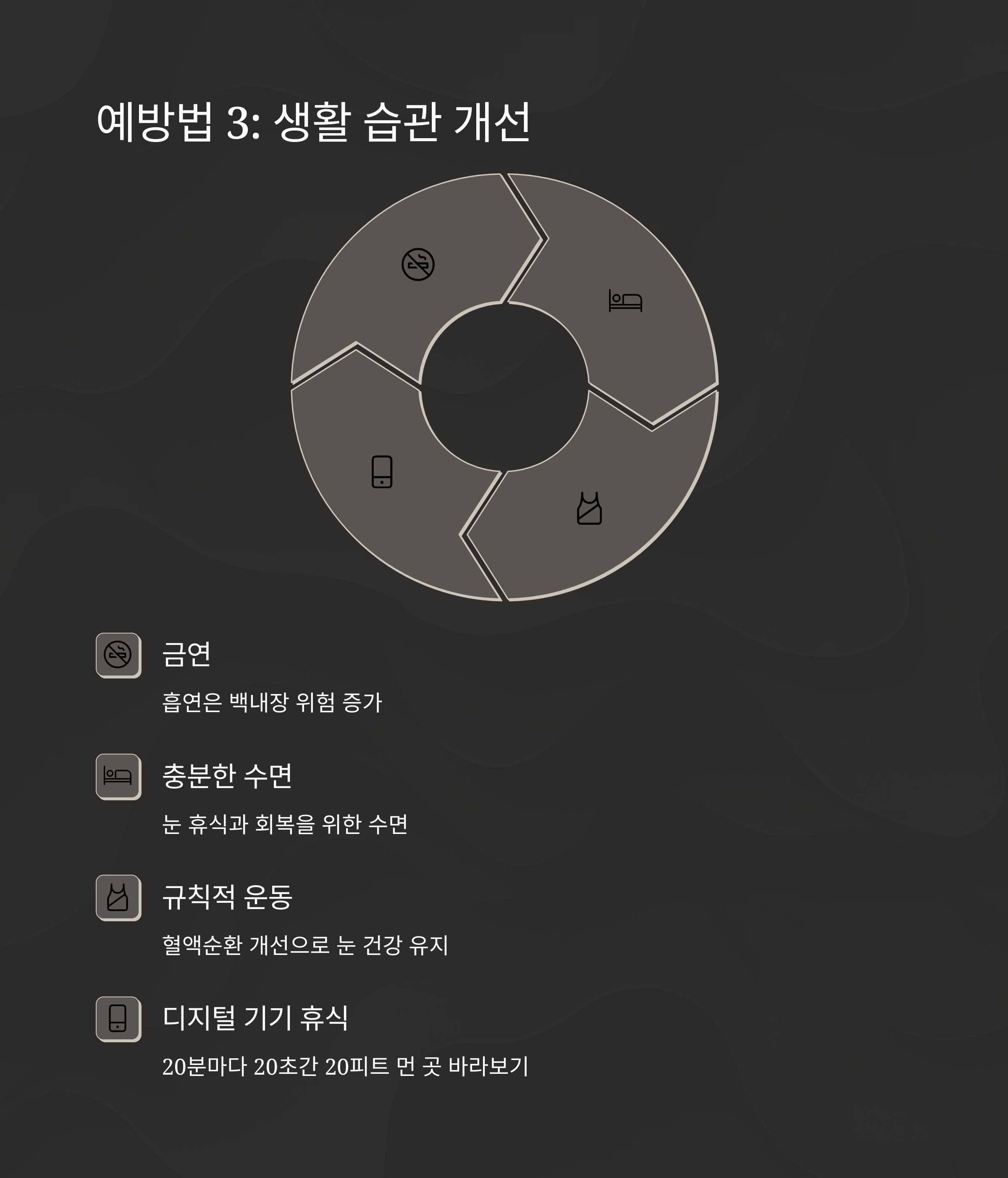 젊은 백내장을 예방하기 위한 생활 습관은 무엇일까요? 무엇보다 중요한 것은 눈에 좋지 않은 습관을 개선하는 거예요. 먼저, 햇빛을 직접 보는 시간을 줄이고, 외출할 때는 자외선 차단 안경을 착용하는 것이 좋습니다. 평소 눈 건강에 도움이 되는 영양소를 섭취하고, 눈에 무리가 가는 행동은 피하는 것도 중요해요.