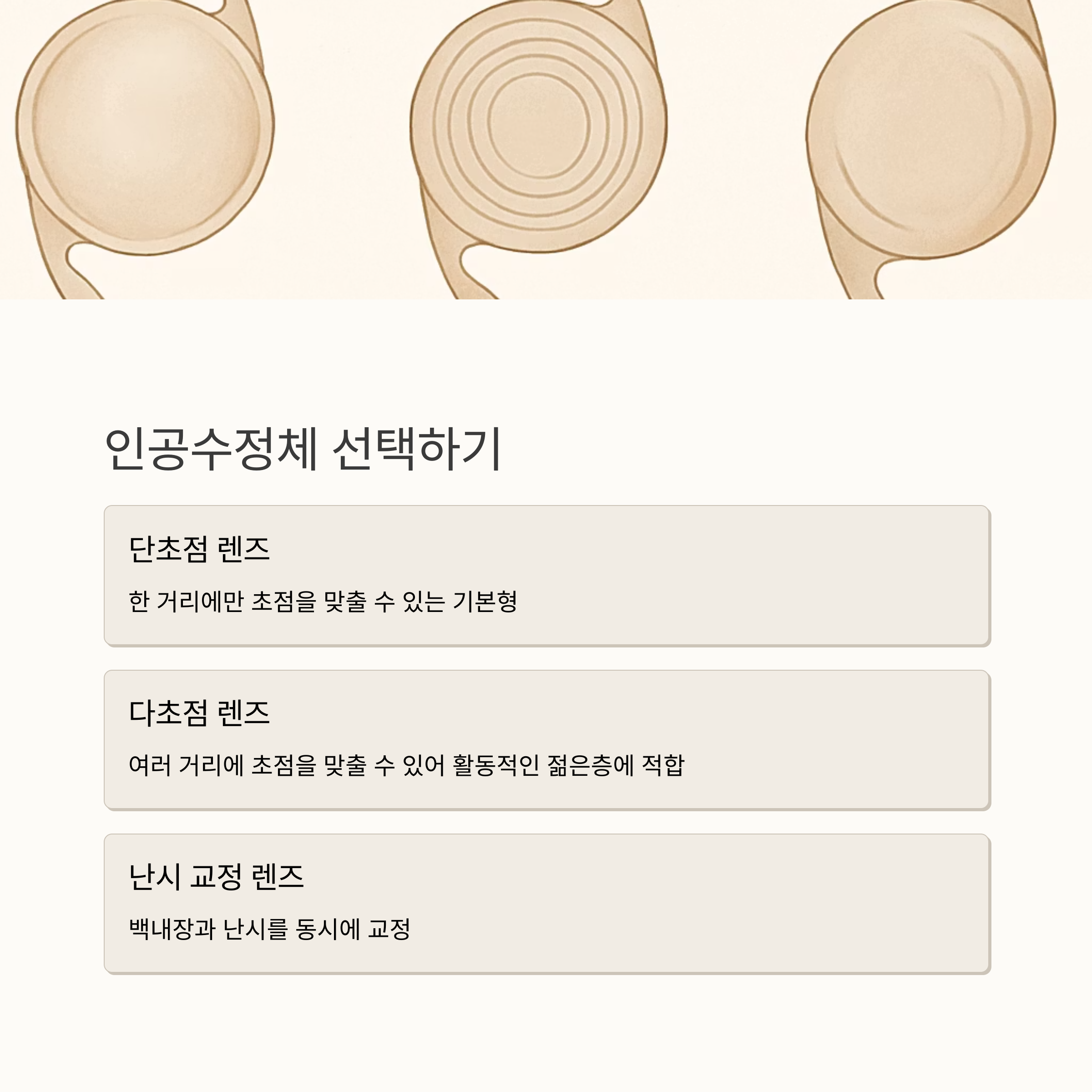 대부분 초음파 유화 흡입술이라는 방법을 사용하는데, 혼탁해진 수정체를 제거하고 인공수정체를 넣는 수술이에요. 수술은 국소 마취로 진행되고, 회복도 빠른 편이랍니다. 인공수정체는 여러 종류가 있는데, 의사와 상담해서 자신에게 맞는 것을 선택해야 해요. 젊은 분들은 활동적인 생활을 많이 하니까, 여러 거리에 초점을 맞출 수 있는 다초점 렌즈를 선택하는 경우도 많아요.