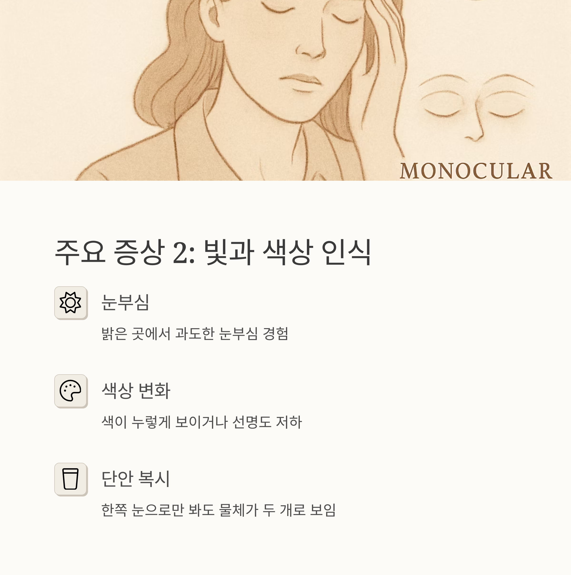 밝은 곳에서 눈부심을 많이 느끼기도 하고요. 심한 경우에는 한쪽 눈으로만 봐도 물체가 두 개로 보이는 단안 복시가 나타날 수도 있어요. 색깔이 좀 누렇게 보인다거나, 예전보다 색깔이 덜 선명하게 느껴지는 증상도 있고요. 이런 증상들이 나타나면 단순히 눈의 피로라고 생각하지 말고 꼭 안과에 가서 검진을 받아보세요.