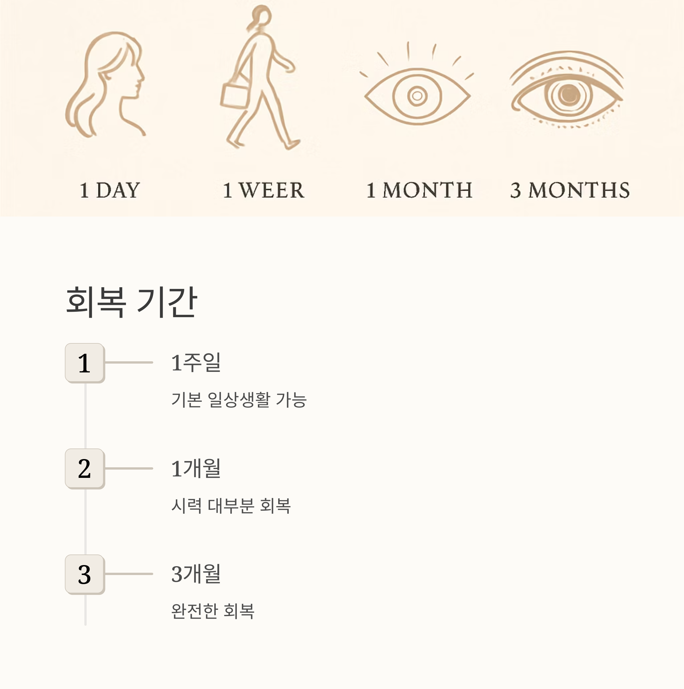 수술 직후에는 보호 안대를 착용하고, 항생제와 소염제 안약을 넣어야 해요. 저는 처음에는 안약 넣는 게 서툴렀지만, 금방 익숙해졌어요. 수술 후 1주일 정도면 일상생활에 어느 정도 복귀할 수 있지만, 완전히 회복되려면 1~2개월 정도 걸린다고 합니다. 수술 후 1주일 동안은 TV 시청이나 스마트폰 사용 시간을 줄이고, 눈에 무리가 가는 행동은 피했어요.