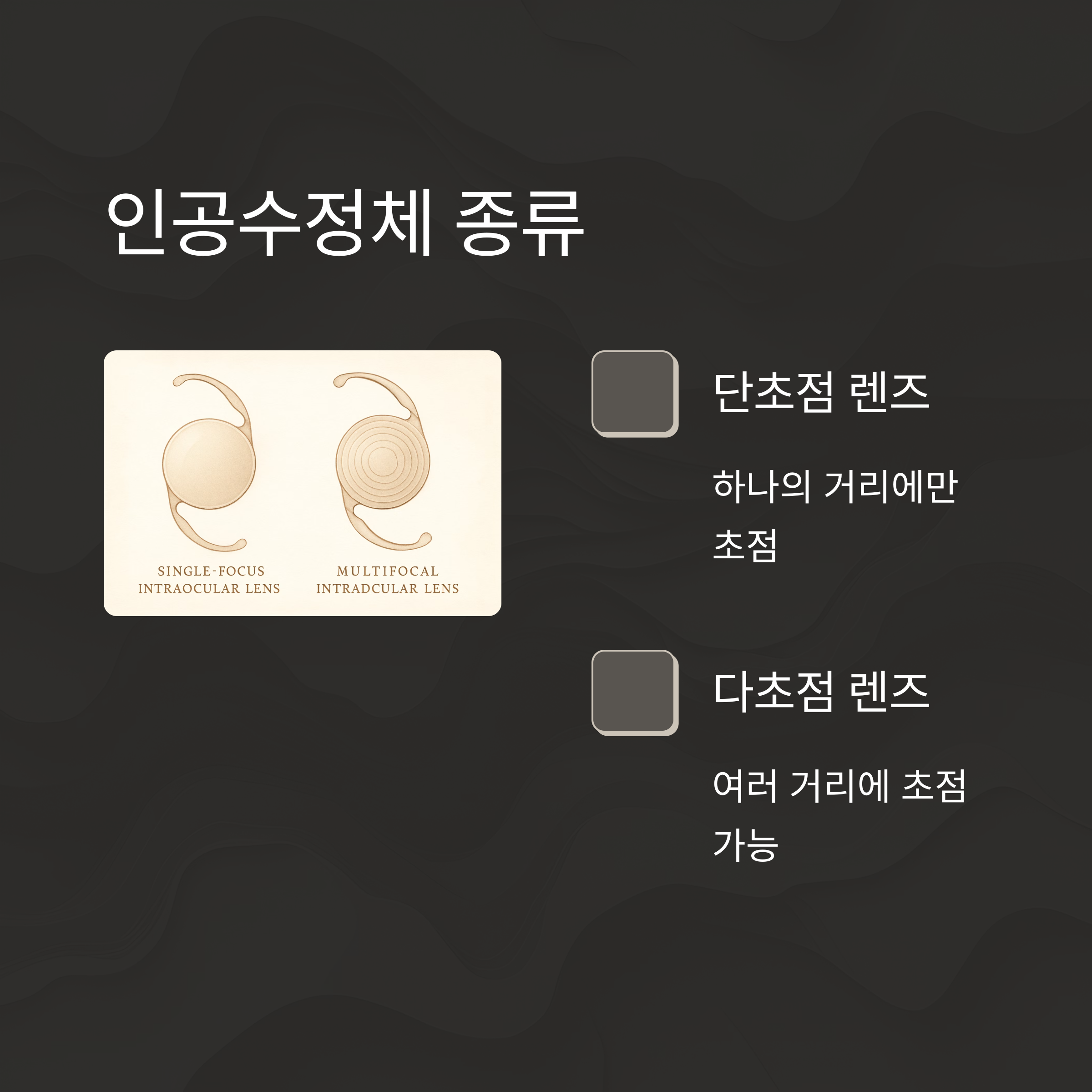 저는 컴퓨터 작업을 많이 하니까 다초점을 선택했죠. 수술 당일에는 긴장을 풀고 음악을 들으면서 병원에 갔어요. 수술실에서는 간호사 선생님이 수술 과정을 다시 설명해주셨고, 궁금한 점을 질문할 수 있었어요. 수술은 20~30분 정도 걸렸는데, 점안 마취라 통증은 거의 없었어요. 눈에 무언가 닿는 느낌은 있었지만요.