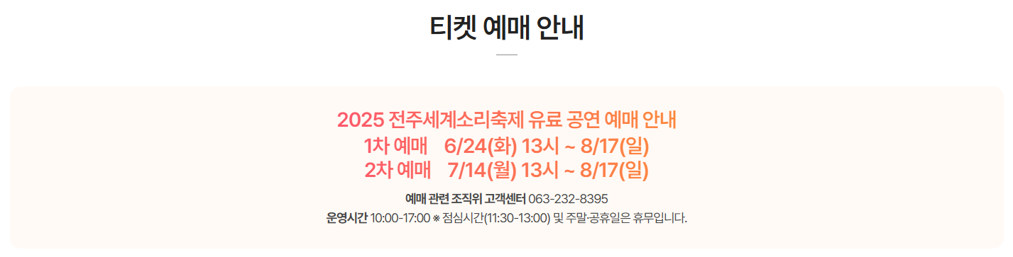 2025 전주세계소리축제의 다채로운 매력을 엿보셨기를 바랍니다. 잊지 못할 음악 여정을 준비하세요! 전주에서 만나요! 이번 축제를 통해 음악의 힘과 아름다움을 다시 한번 느끼고, 소중한 추억을 만들어 가시길 바랍니다. 전통과 현대, 세계가 하나 되는 아름다운 시간을 기대하며, 곧 전주에서 만나 뵙겠습니다!