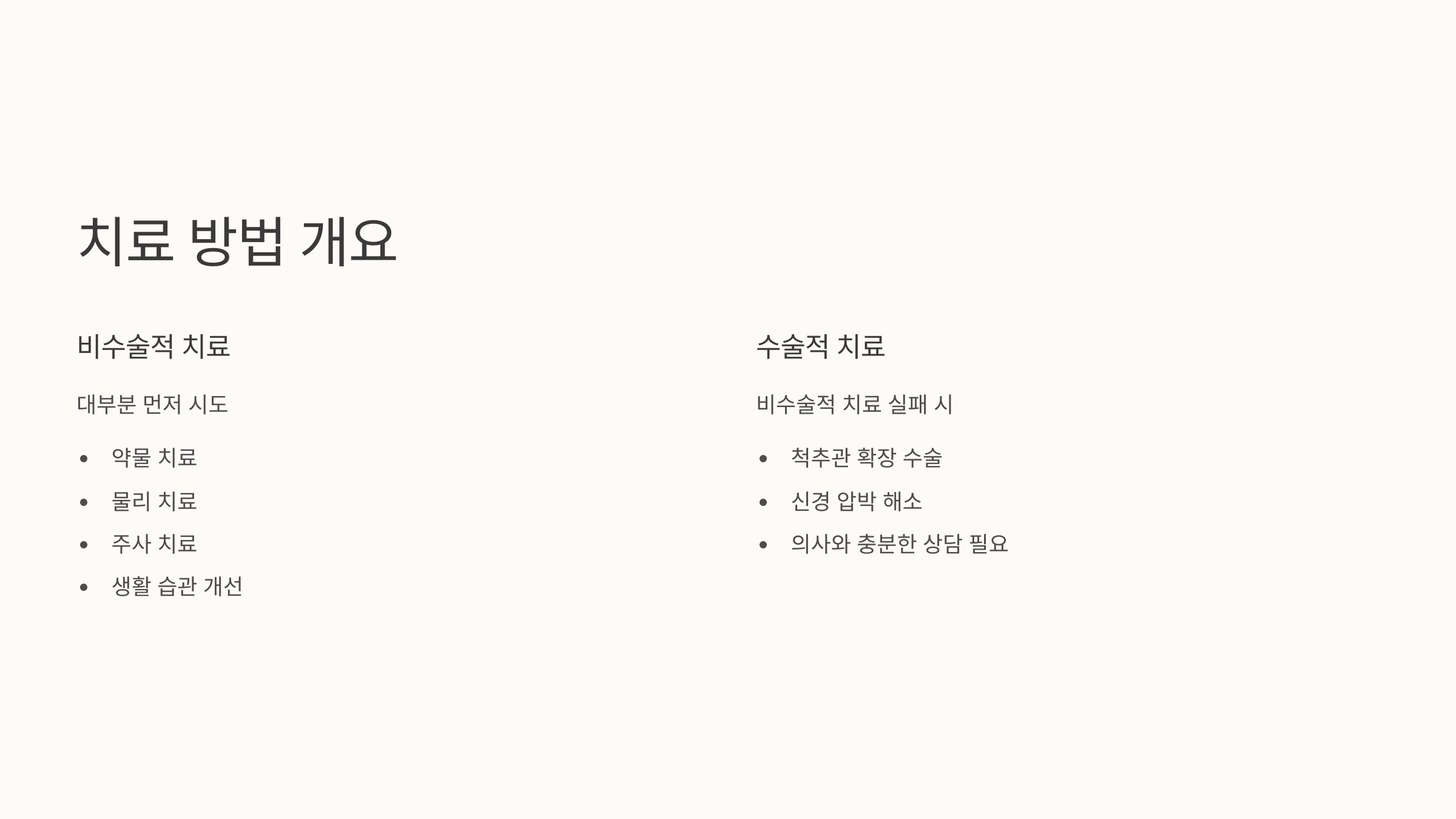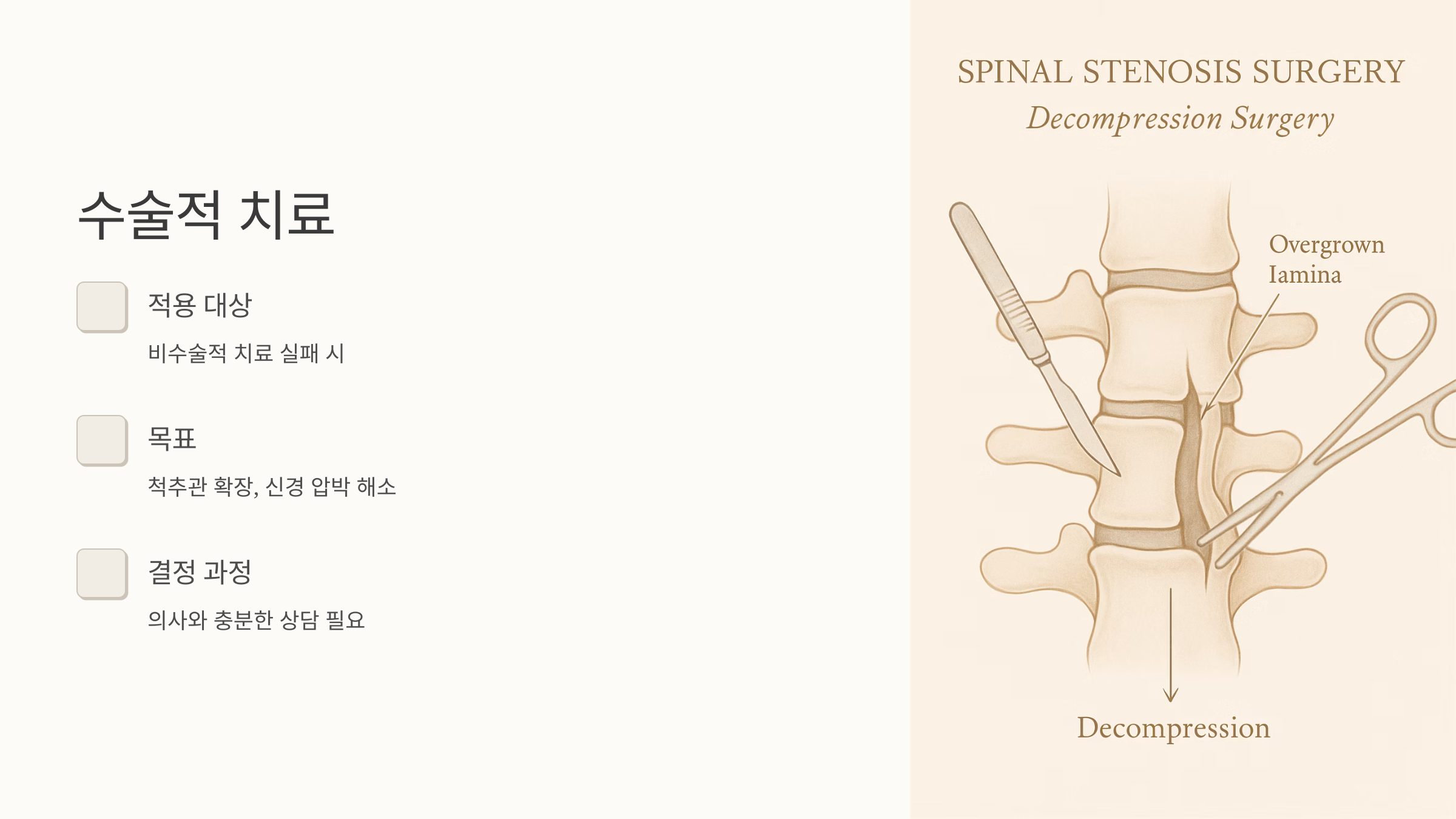 수술은 척추관을 넓혀 신경 압박을 해소하는 것을 목표로 하죠. 하지만 수술은 마지막 방법으로 생각하고, 의사와 충분히 상의하여 신중하게 결정해야 합니다.