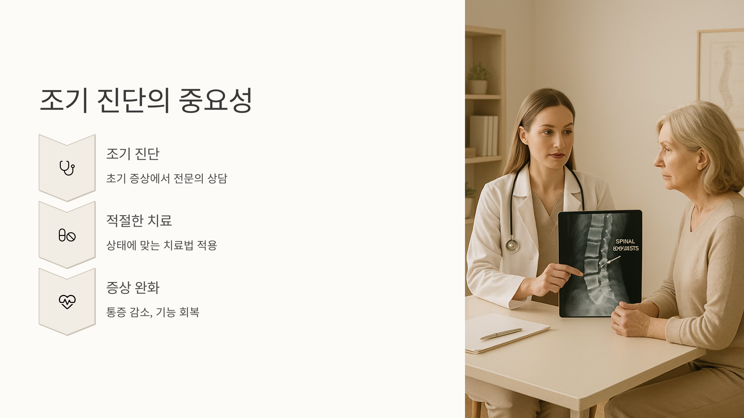 이런 증상이 나타나면 바로 병원을 찾는 것이 중요해요. 증상이 심하지 않더라도 일상생활에 불편함이 있다면 전문가의 진료를 받아보세요. 초기에 관리하면 척추관 협착증 증상 악화를 막고 삶의 질을 높일 수 있습니다. 내 몸의 신호를 잘 듣고, 작은 변화에도 귀 기울이는 것이 중요해요.