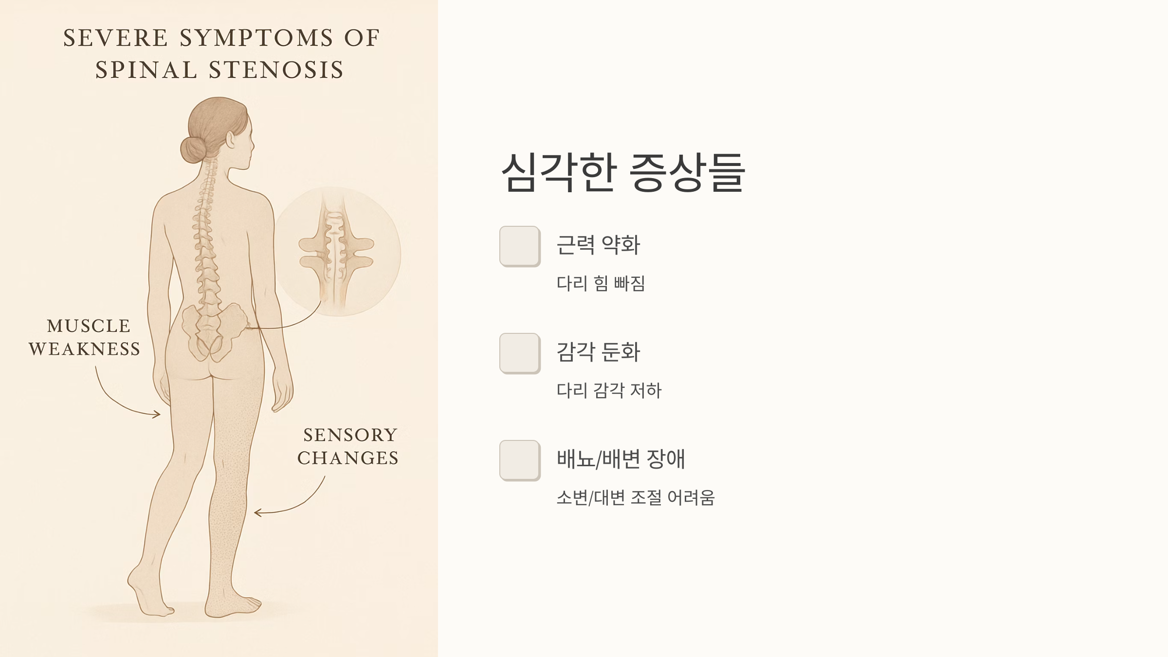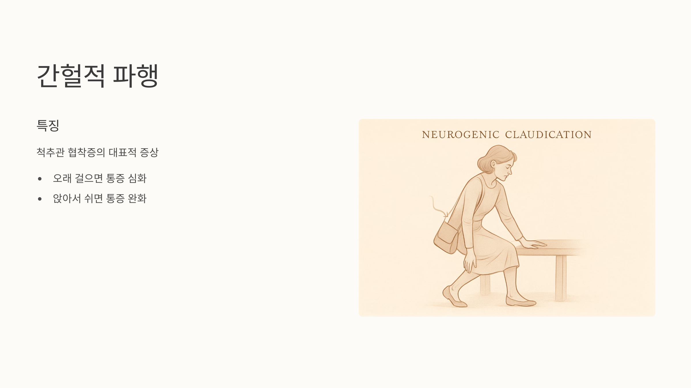 이걸 '간헐적 파행'이라고 부르는데, 척추관 협착증의 대표적인 증상 중 하나입니다. 심한 경우에는 다리 근력이 약해지거나, 감각이 둔해지기도 하고, 심지어 소변이나 대변을 조절하기 어려울 수도 있어요.