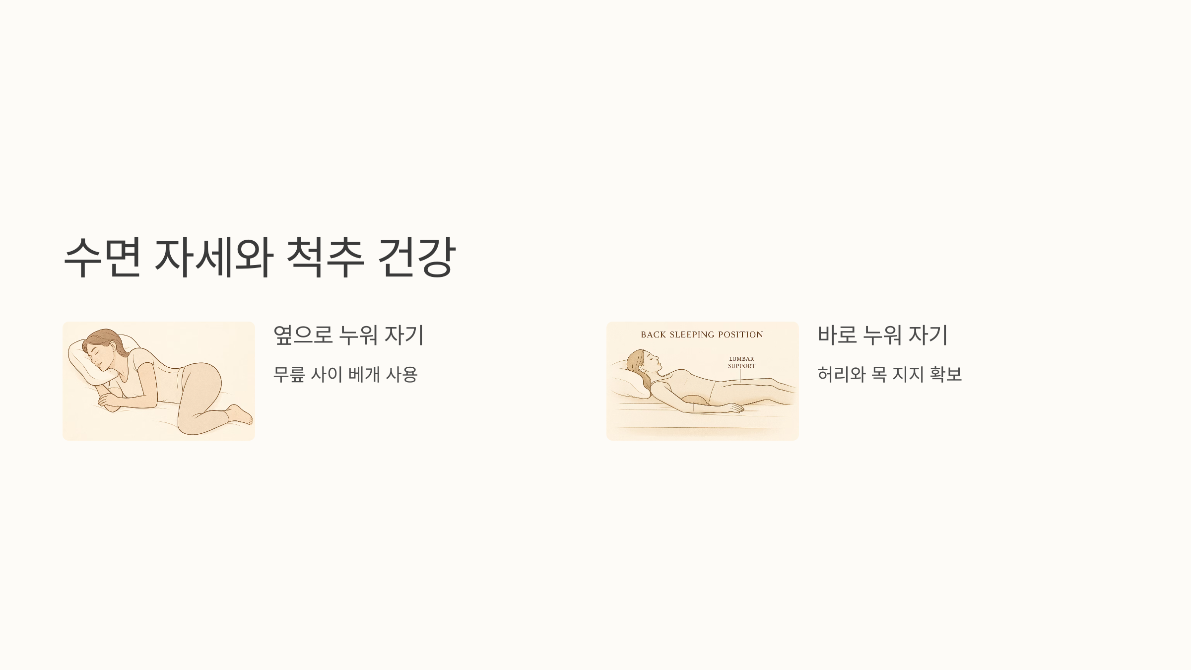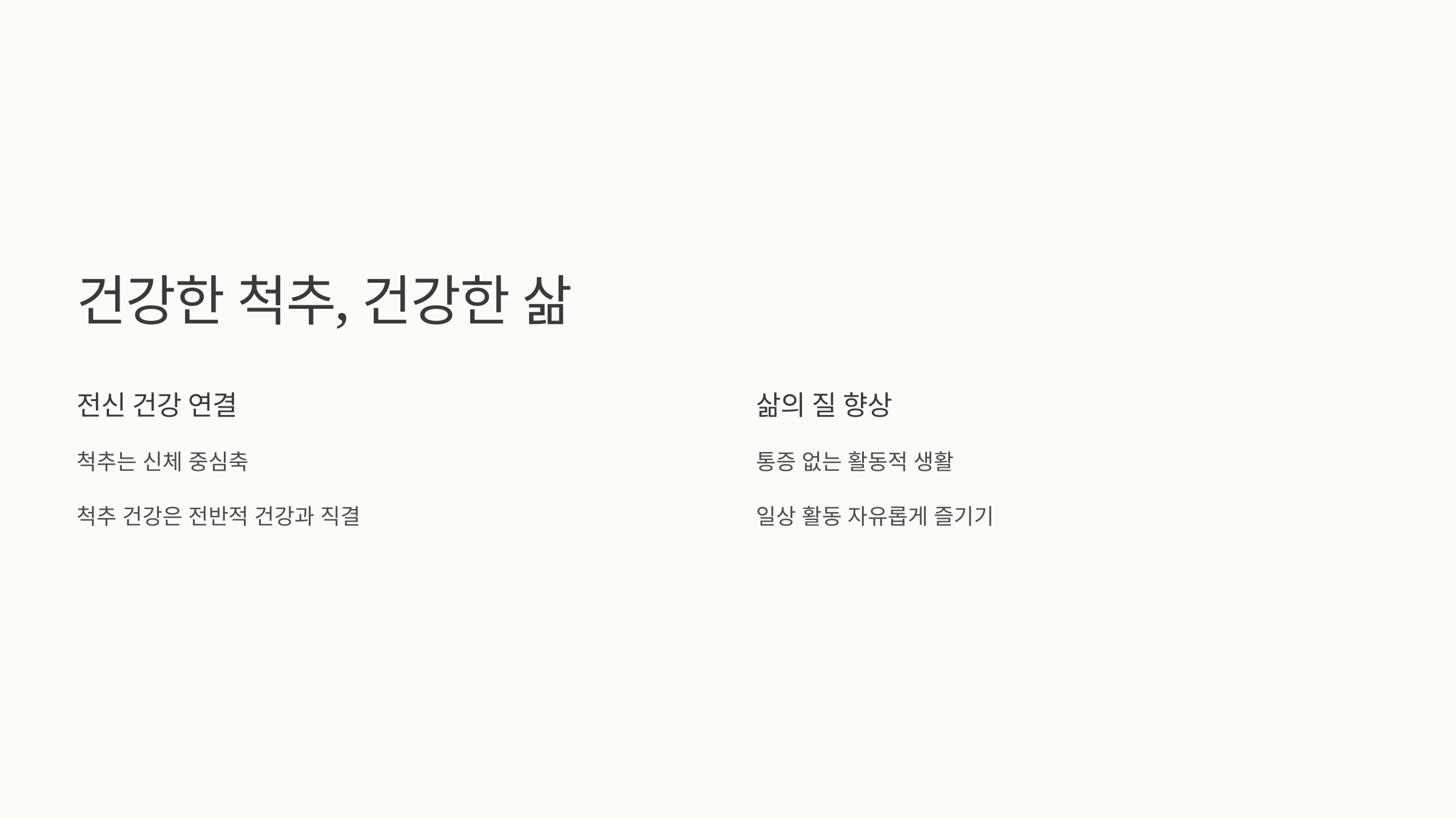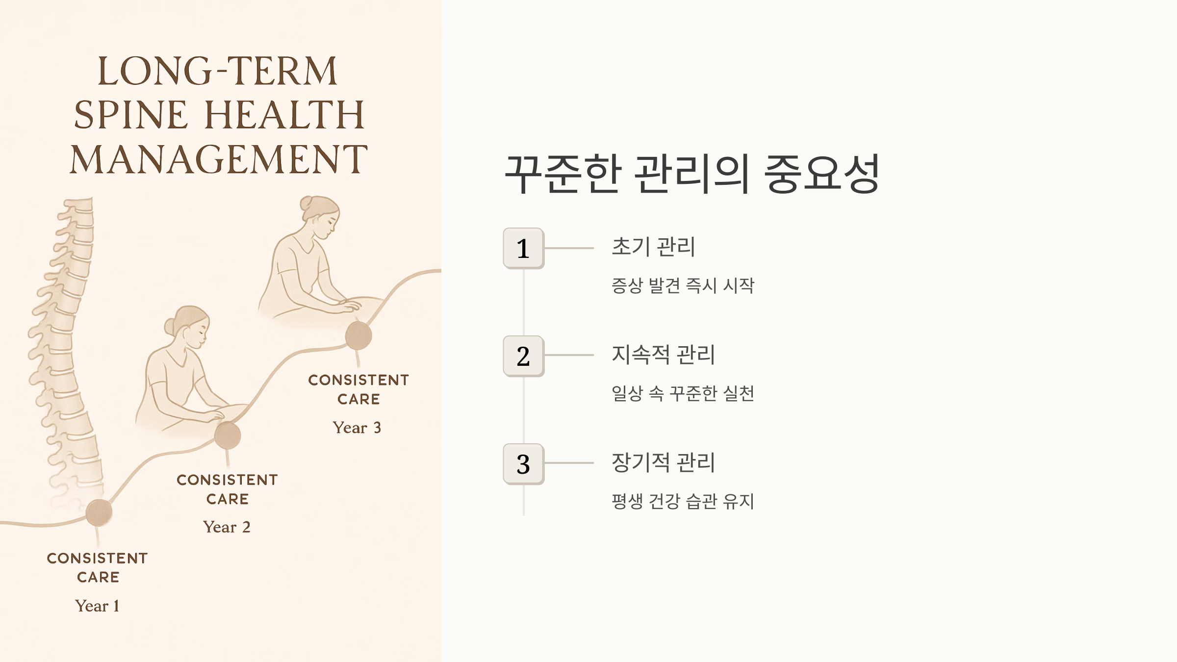 무엇보다 중요한 것은 스스로 자신의 몸 상태를 잘 살피고, 통증이나 불편함이 느껴질 때 적절한 조치를 취하는 것입니다. 꾸준한 관리와 노력을 통해 척추 건강을 유지하고, 건강한 삶을 누릴 수 있도록 노력합시다.