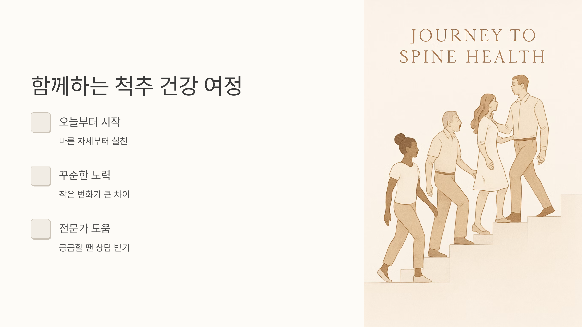 척추 건강을 위한 꾸준한 노력이 건강한 삶을 만들어갑니다. 작은 변화부터 시작해 보세요. 오늘부터 바른 자세를 유지하고, 가벼운 운동을 꾸준히 하면서 건강한 습관을 만들어 나가는 것이 중요해요. 작은 노력들이 모여 큰 변화를 가져온다는 것을 기억하세요! 그리고 언제든지 궁금한 점이 있으면 전문가와 상담하는 것을 잊지 마세요. 건강한 척추, 건강한 삶을 향한 여정을 응원합니다.