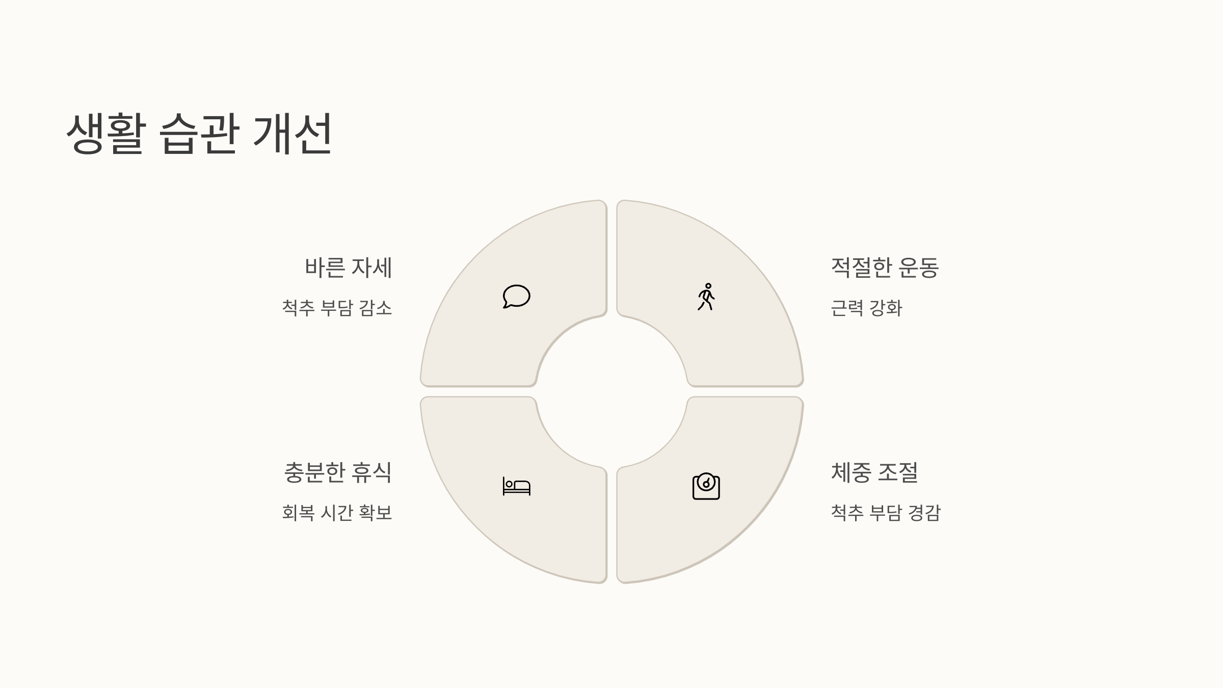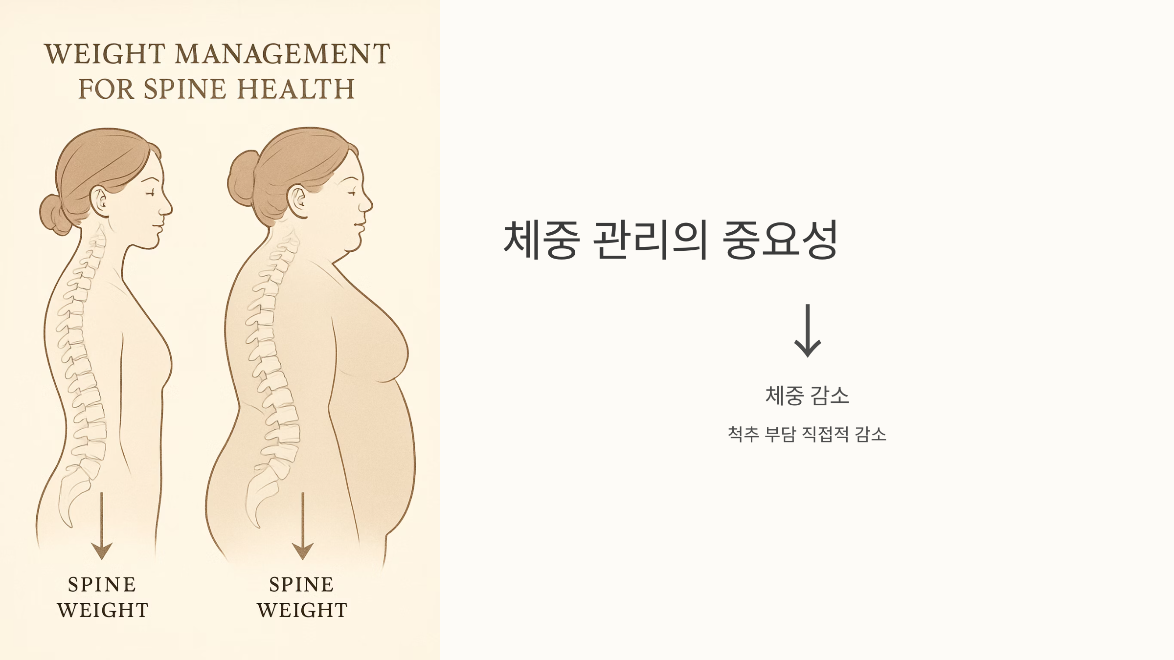 체중 조절도 중요한데요, 과체중이나 비만은 척추에 부담을 더할 수 있으니 적정 체중을 유지하는 것이 좋습니다. 전문가의 도움을 받아 물리치료나 도수치료를 병행하는 것도 효과적일 수 있어요.
