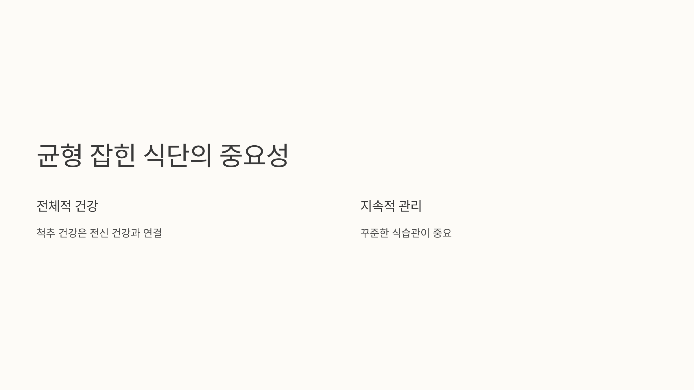 균형 잡힌 식단과 건강한 식습관은 척추 건강뿐 아니라 전반적인 건강 관리에도 매우 중요해요. 건강한 음식을 꾸준히 섭취하면서 건강한 몸을 만드는 데 노력하는 것은 척추 건강을 지키는 가장 기본적이고 중요한 방법 중 하나입니다. 잊지 마세요, 우리가 먹는 음식이 우리 몸을 만듭니다.