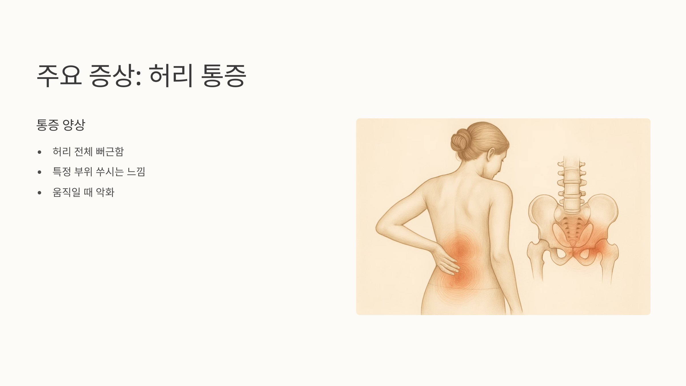 척추관 협착증 증상은 사람마다 조금씩 다를 수 있지만, 흔히 나타나는 몇 가지 증상을 알려드릴게요. 가장 흔한 증상은 바로 허리 통증이에요. 허리 전체가 뻐근하거나, 특정 부위가 콕콕 쑤시는 느낌이 들 수도 있죠.