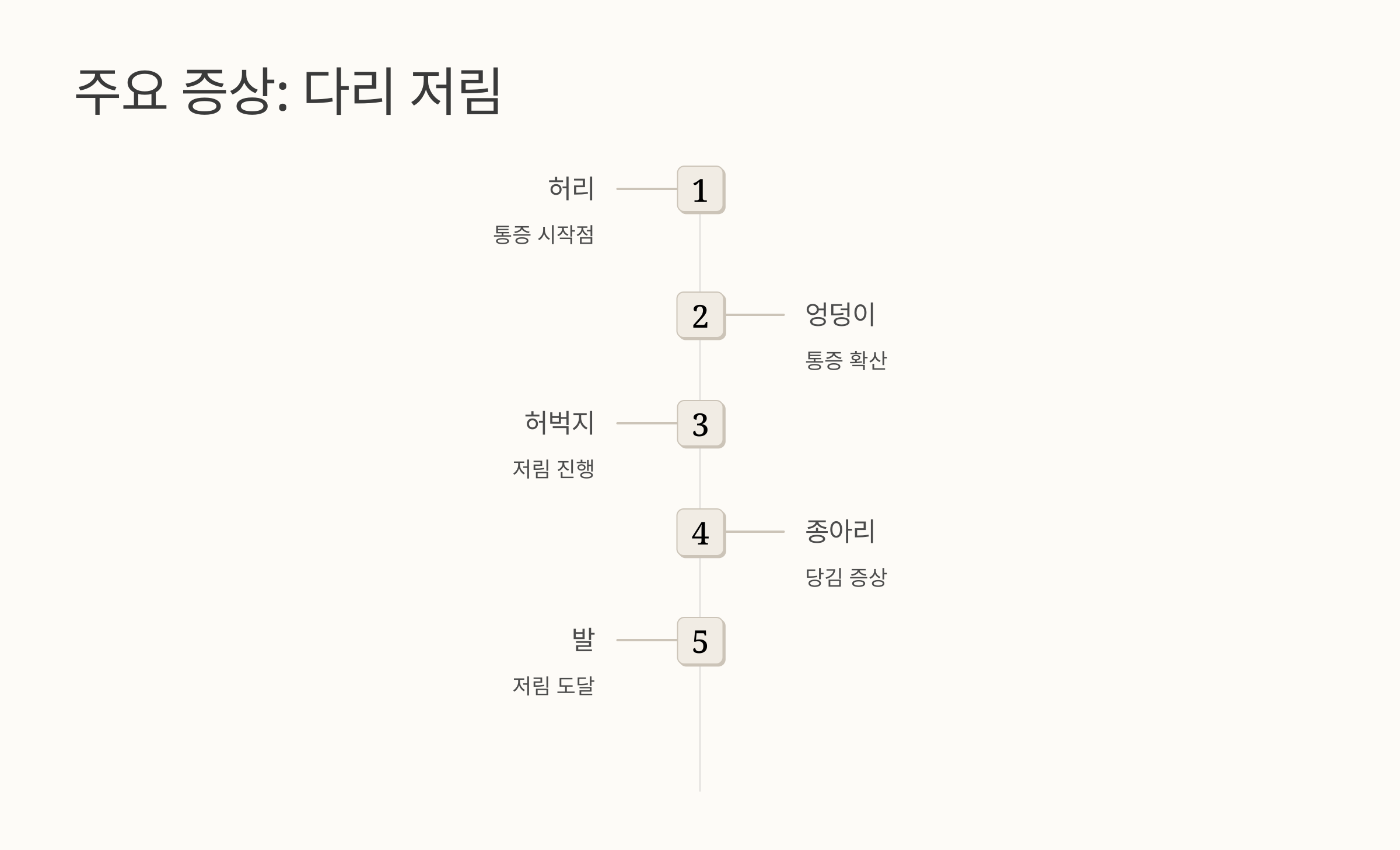 그리고 많은 분들이 다리 저림이나 당김을 호소하세요. 허리에서 시작해서 엉덩이, 허벅지, 종아리, 발까지 저릿저릿하거나 당기는 느낌이 내려가는 거죠. 특히 오래 걷거나 서 있으면 통증이 심해지고, 앉아서 쉬면 통증이 완화되는 특징이 있어요.