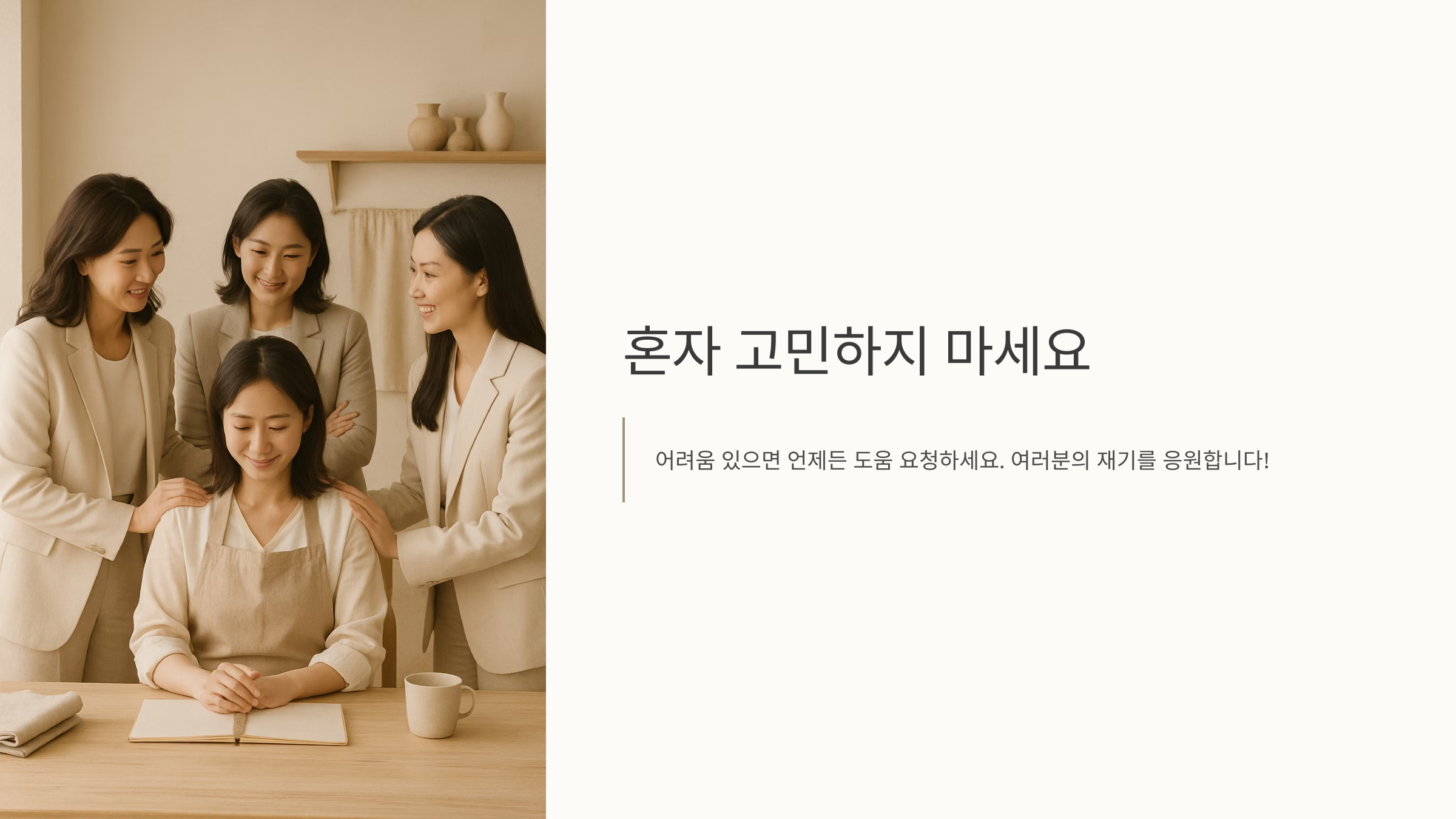 신청 과정에서 궁금한 점이 있거나, 서류 준비가 어려우시다면 주저하지 말고 새출발기금 전담 콜센터(1660-1378) 또는 신용회복위원회(1600-5500)로 연락하세요. 평일 오전 9시부터 오후 6시까지 친절하게 상담해 드립니다.