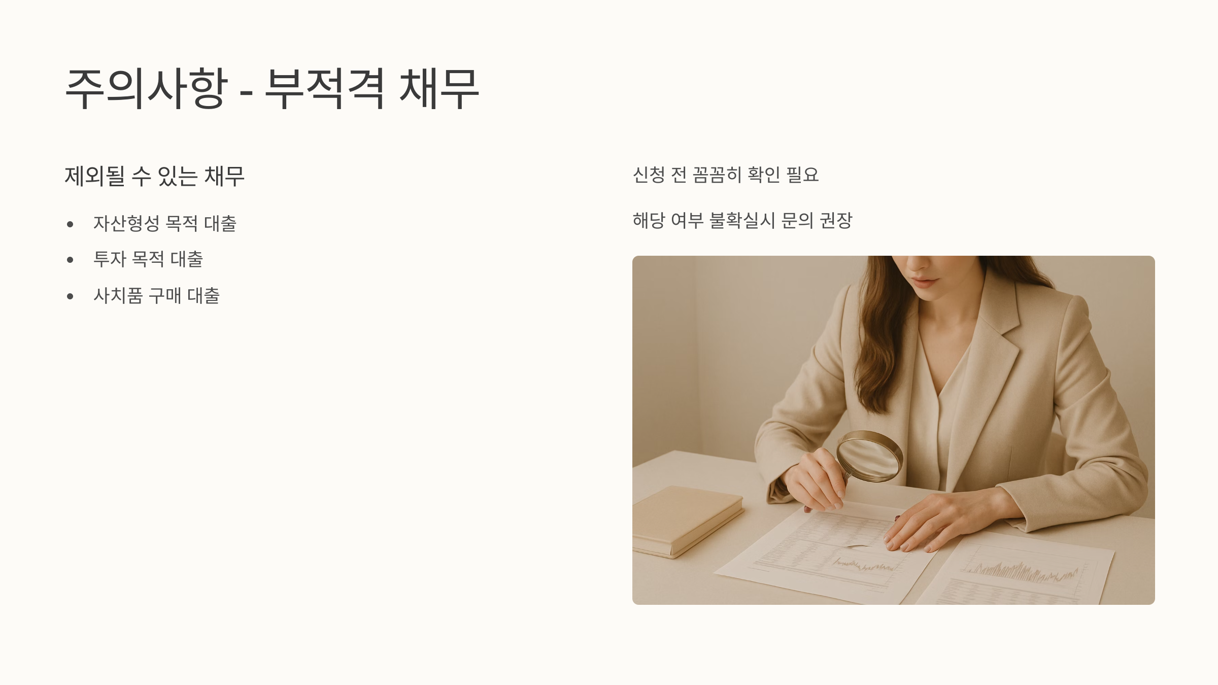 또한, 새출발기금에 해당되지 않는 부적격 채무(자산형성 목적 대출 등)는 제외될 수 있으니, 신청 전에 꼼꼼하게 확인하시는 것이 중요합니다. 꼼꼼하게 확인하고 진행하면 더욱 안전하게 새출발기금을 이용하실 수 있을 거예요.