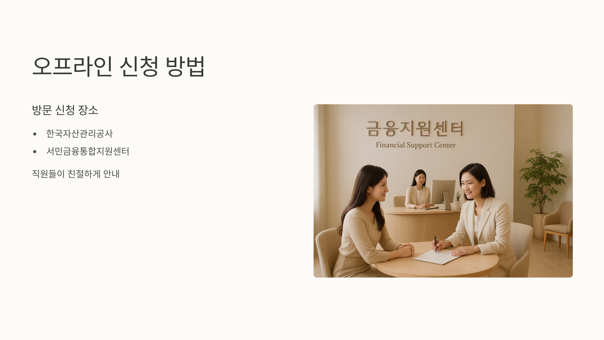 인터넷 사용이 어려우시거나, 서류 준비가 복잡하게 느껴지시는 분들은 가까운 한국자산관리공사나 서민금융통합지원센터를 방문해서 오프라인으로 신청하실 수도 있습니다. 직원분들이 친절하게 안내해 주시니까 편하게 문의해 보세요. 어떤 방법을 선택하든 필요한 서류만 미리 준비해 두면 어렵지 않게 진행하실 수 있답니다.