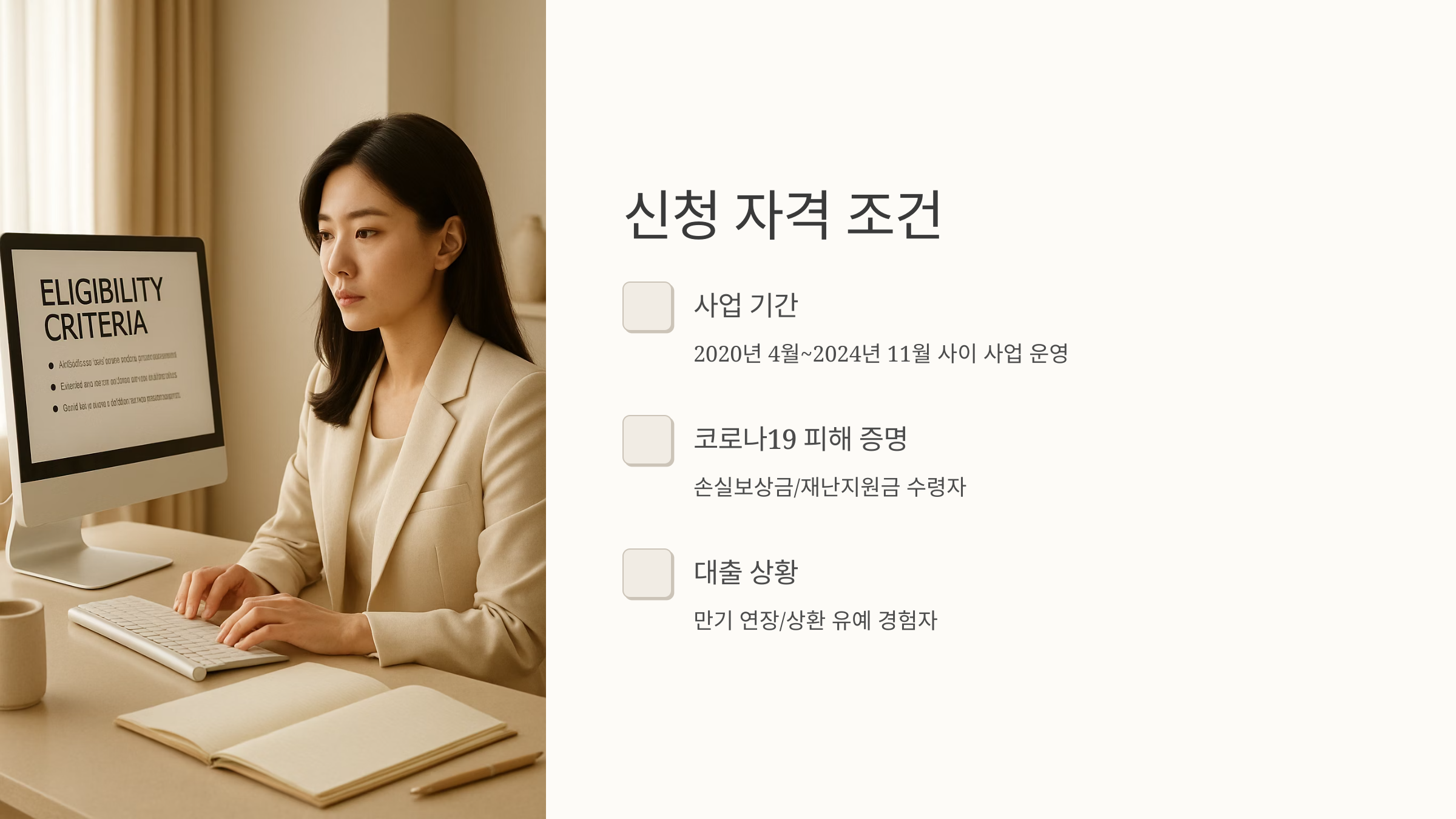 구체적으로는 2020년 4월부터 2024년 11월 사이에 사업을 하셨고, 손실보상금이나 재난지원금을 받으셨거나, 대출 만기 연장이나 상환 유예를 받으신 적이 있거나, 코로나19로 인한 피해를 증명할 수 있는 분들이 대상입니다.