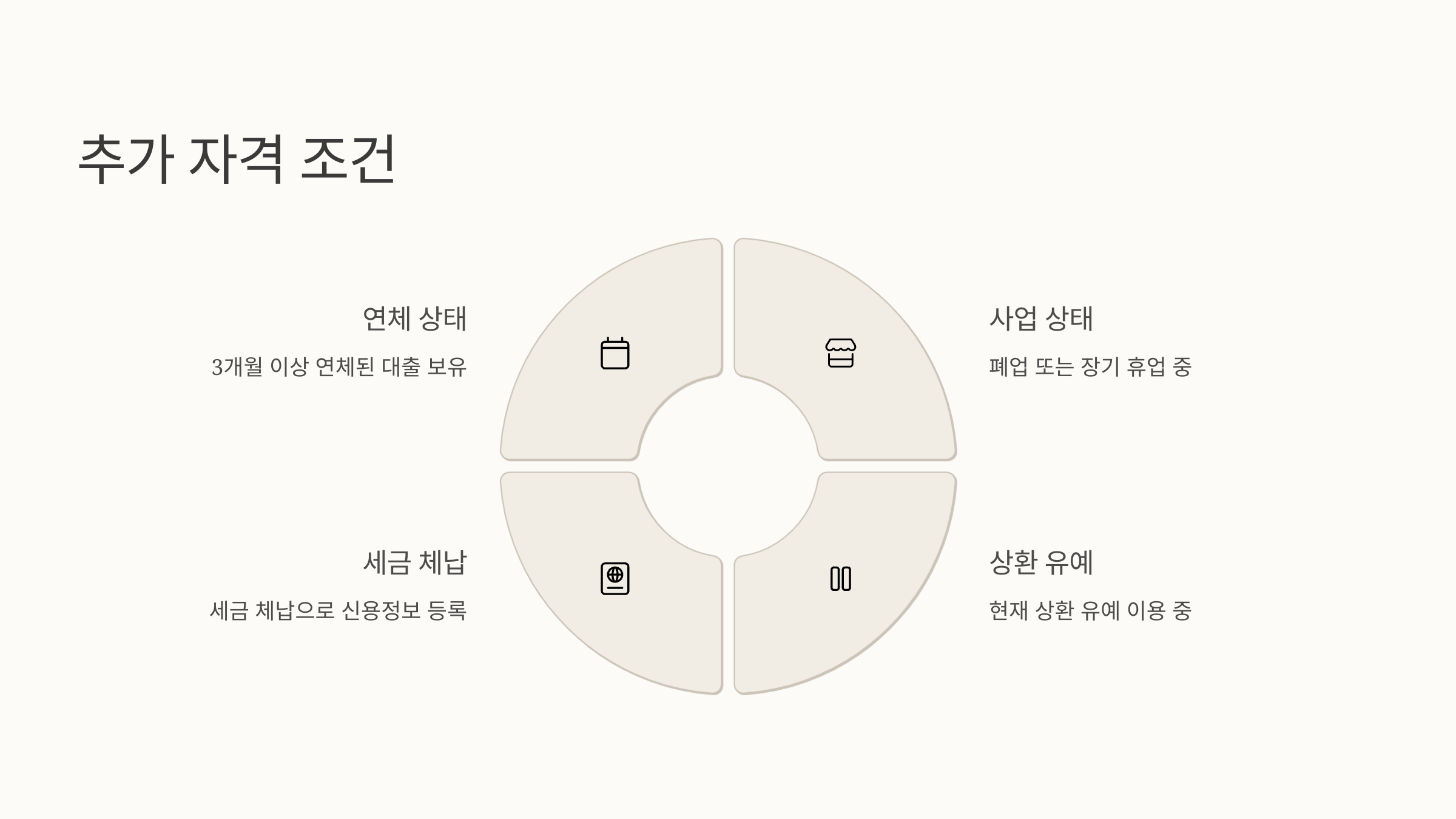 또, 빚 때문에 힘드신 분이어야 하는데요. 3개월 이상 연체된 대출이 있거나, 폐업이나 장기 휴업 중이거나, 상환 유예를 이용 중이신 분, 세금 체납으로 신용 정보에 등록된 분들도 신청 가능합니다. 만약 본인이 이 조건에 해당한다면, 희망을 잃지 마세요. 자격 확인은 정부 공식 홈페이지를 통해서 다시 한번 확인해 보세요.