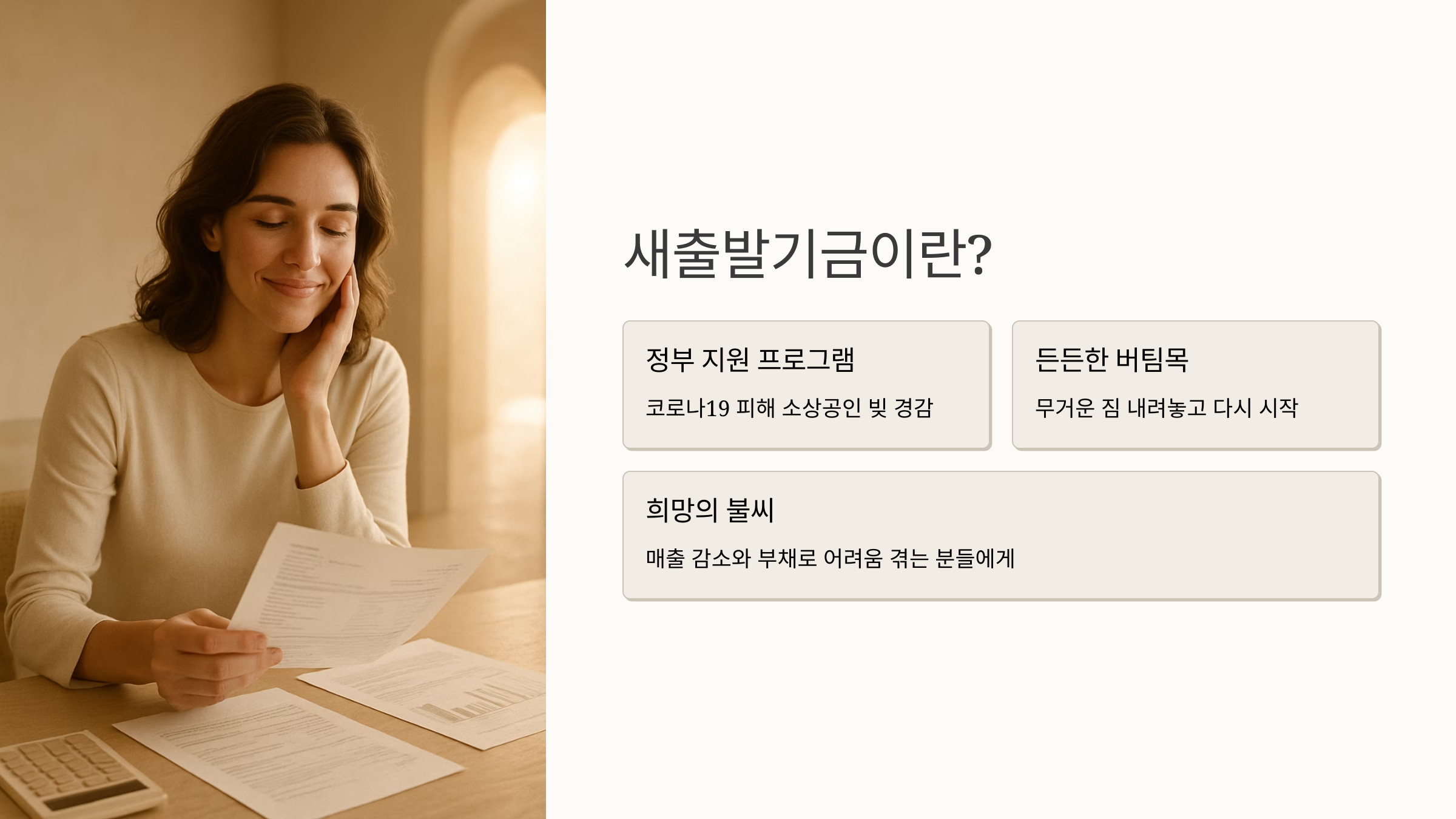 안녕하세요! 코로나19로 어려움을 겪고 계신 소상공인 여러분을 위한 따뜻한 정보를 준비했습니다. 새출발기금부터 자격조건, 주의사항까지 꼼꼼하게 알려드릴게요. 힘든 시기를 잘 헤쳐나가실 수 있도록 최선을 다해 도와드리겠습니다. 함께 긍정적인 미래를 만들어가요!