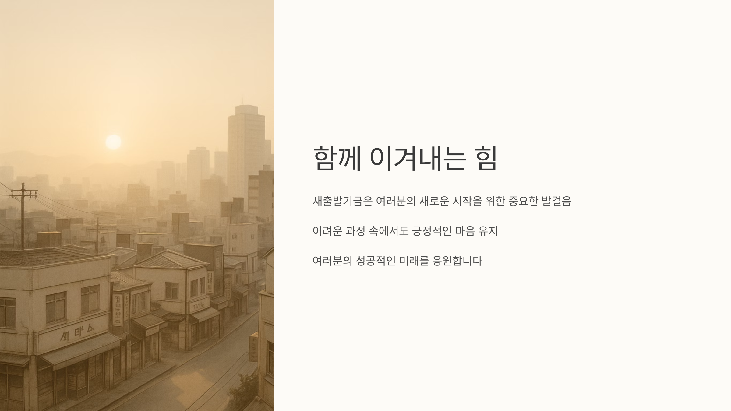 혼자 고민하지 마시고, 언제든지 도움을 요청하세요. 여러분의 재기를 응원합니다! 새출발기금, 어렵지 않으니 꼭 도전해 보세요! 힘든 시기를 극복하고 다시 꿈을 향해 나아가실 수 있도록 정부와 저희가 함께 응원하겠습니다. 새로운 시작을 진심으로 축하드립니다!