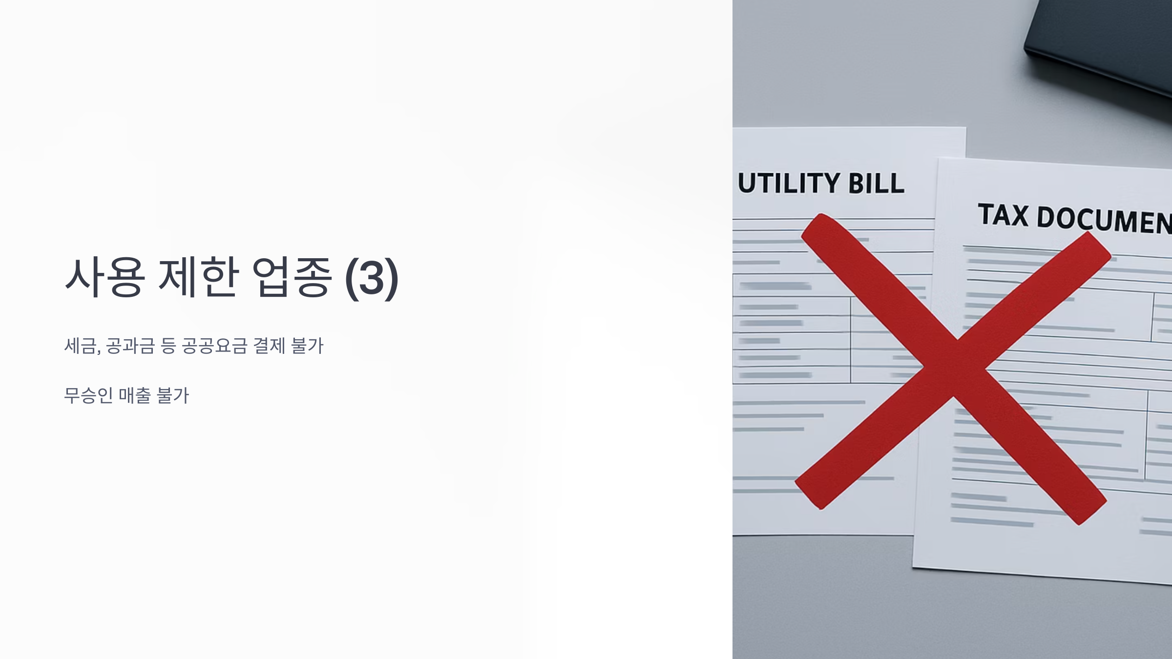 상품권 판매점이나 귀금속 매장, 세금이나 공과금 같은 공공요금 결제도 안 된다는 점, 꼭 기억해 주세요. 그리고 무승인 매출도 안 된다는 점 명심해야 합니다! 제한되는 업종을 미리 알아두고 괜히 낭패 보는 일 없도록 주의하세요!