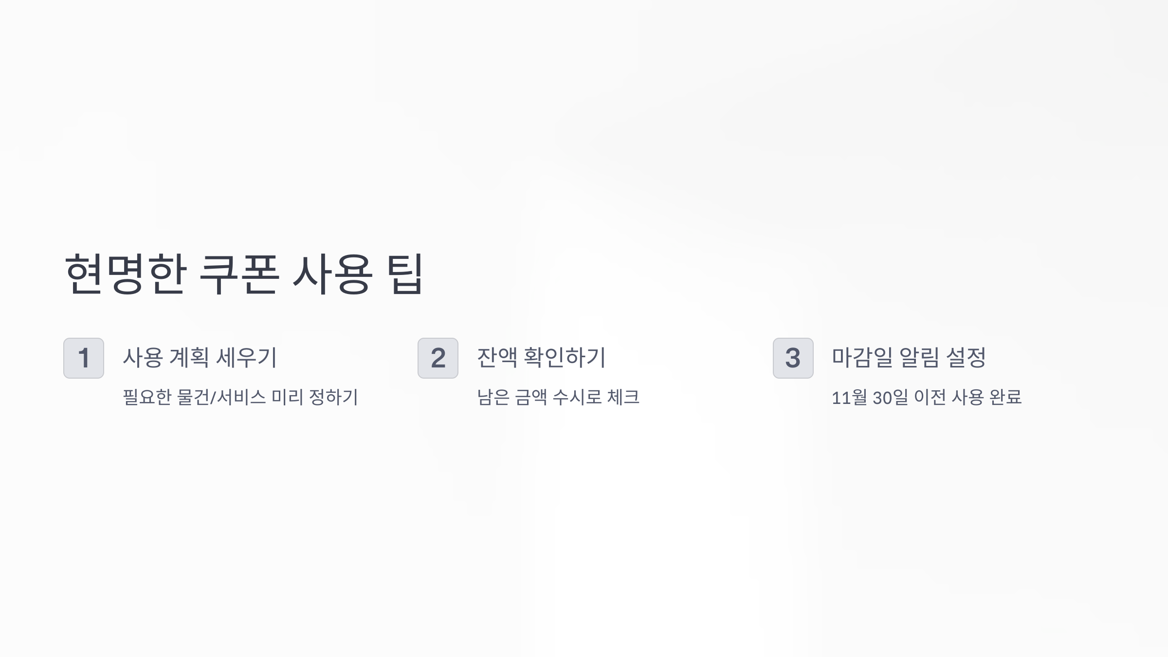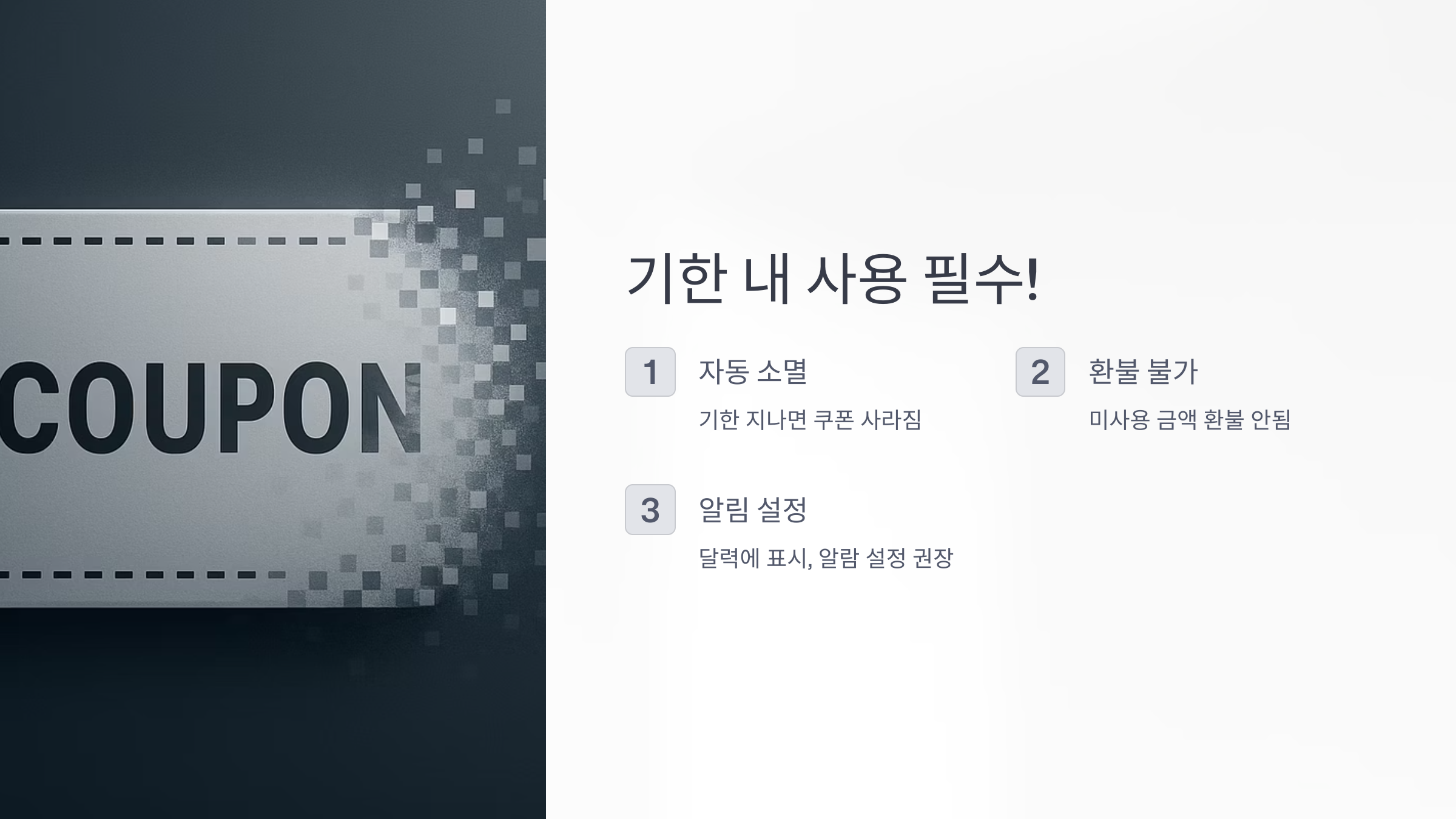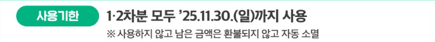 자, 먼저 가장 중요한 사용 기간부터 짚고 넘어가야겠죠? 2025년 11월 30일! 이 날짜를 꼭 기억해 두세요. 1차, 2차 지급분 모두 이 날짜까지 사용해야 합니다. 기한이 지나면 쿠폰은 자동으로 사라져요. 환불도 안 된다는 사실! 지금부터 달력에 빨간 펜으로 표시하고, 잊지 않도록 알람도 설정해두는 센스! 혹시라도 놓치지 않도록 사용 예정 금액을 미리 적어두는 것도 좋겠죠? 카드형이든 상품권형이든, 마감일 전에 꼭 사용하도록 해요! 소중한 혜택, 놓치지 말고 꼭 사용해야겠죠? 마지막 기회를 놓치지 마시고 알뜰하게 사용해보세요. 주변 사람들에게도 알려주는 센스! 함께 풍요로운 삶을 만들어 가요.