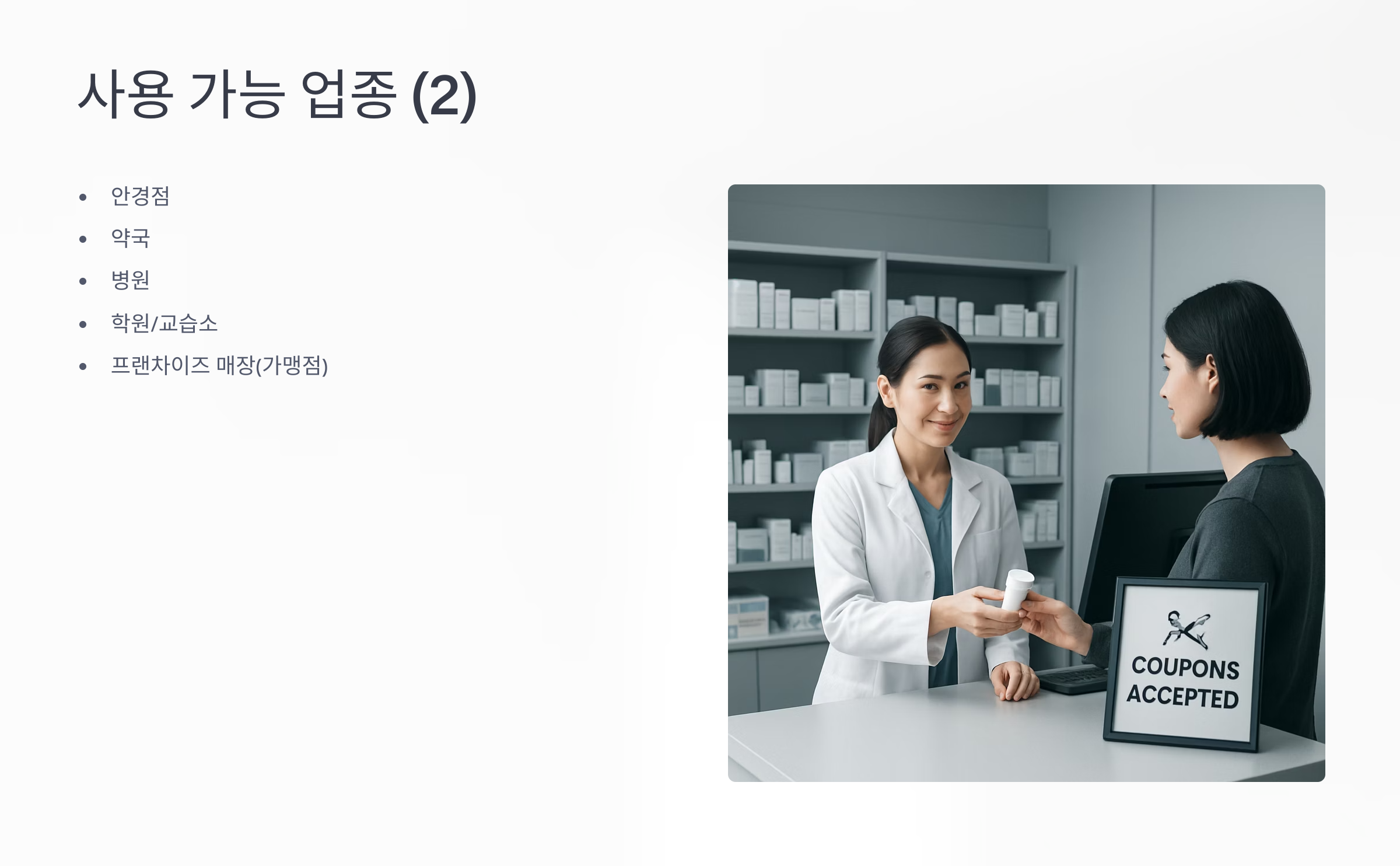 쿠폰 사용 가능한 곳은 정말 다양해요. 동네 마트나 전통시장부터, 맛있는 음식을 파는 식당, 옷 가게, 미용실, 안경점, 약국, 병원까지! 학원이나 교습소에서도 사용 가능하답니다.