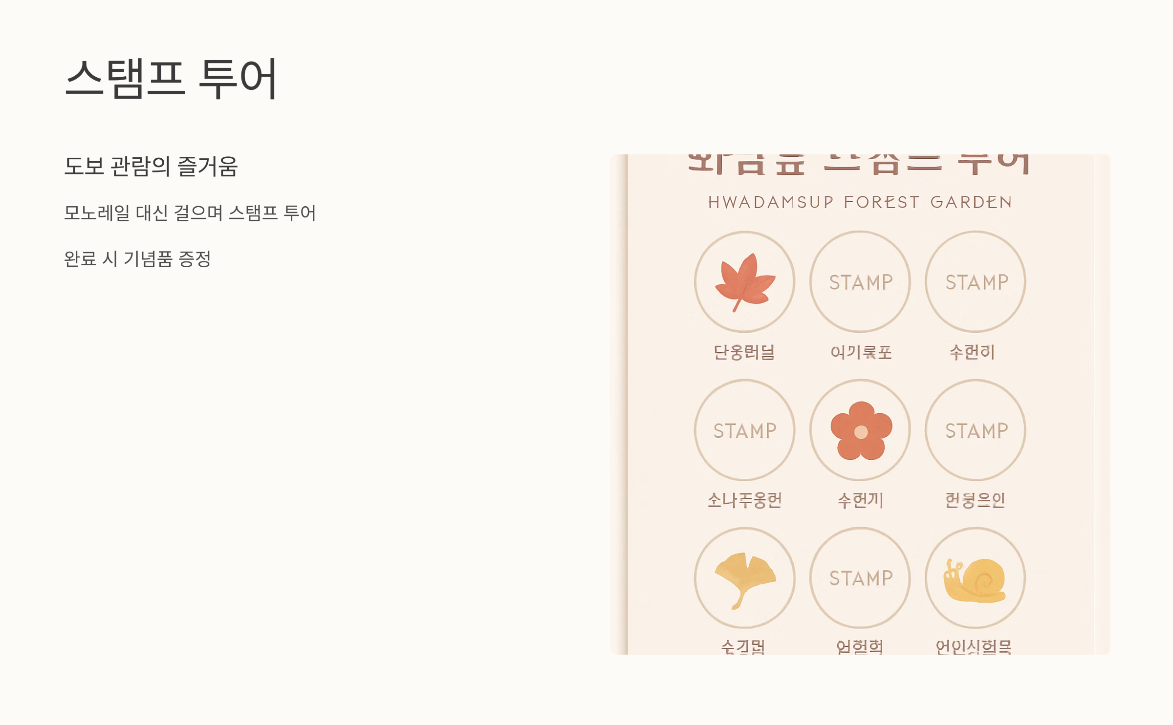 중요한 건, 중간에 내렸다가 다시 탈 수 없으니 신중하게 이용하세요! 모노레일 대신 도보로 숲을 걸으면서 스탬프 투어를 완료하면 기념품도 받을 수 있어요! 화담채에서는 특별한 전시와 체험을 할 수 있으니, 시간이 된다면 꼭 들러보세요.
