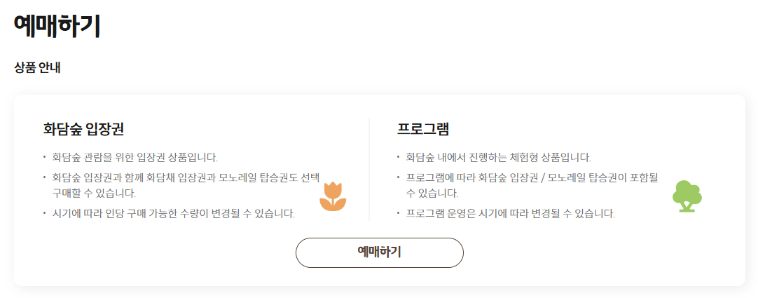 홈페이지에 접속해서 원하는 날짜와 시간을 골라주세요. 성인, 청소년, 어린이 티켓 중에서 필요한 티켓을 선택하고, 모노레일이나 화담채 입장권도 추가하면 된답니다. 회원가입하고 결제까지 마치면 화담숲 예약하기 끝!