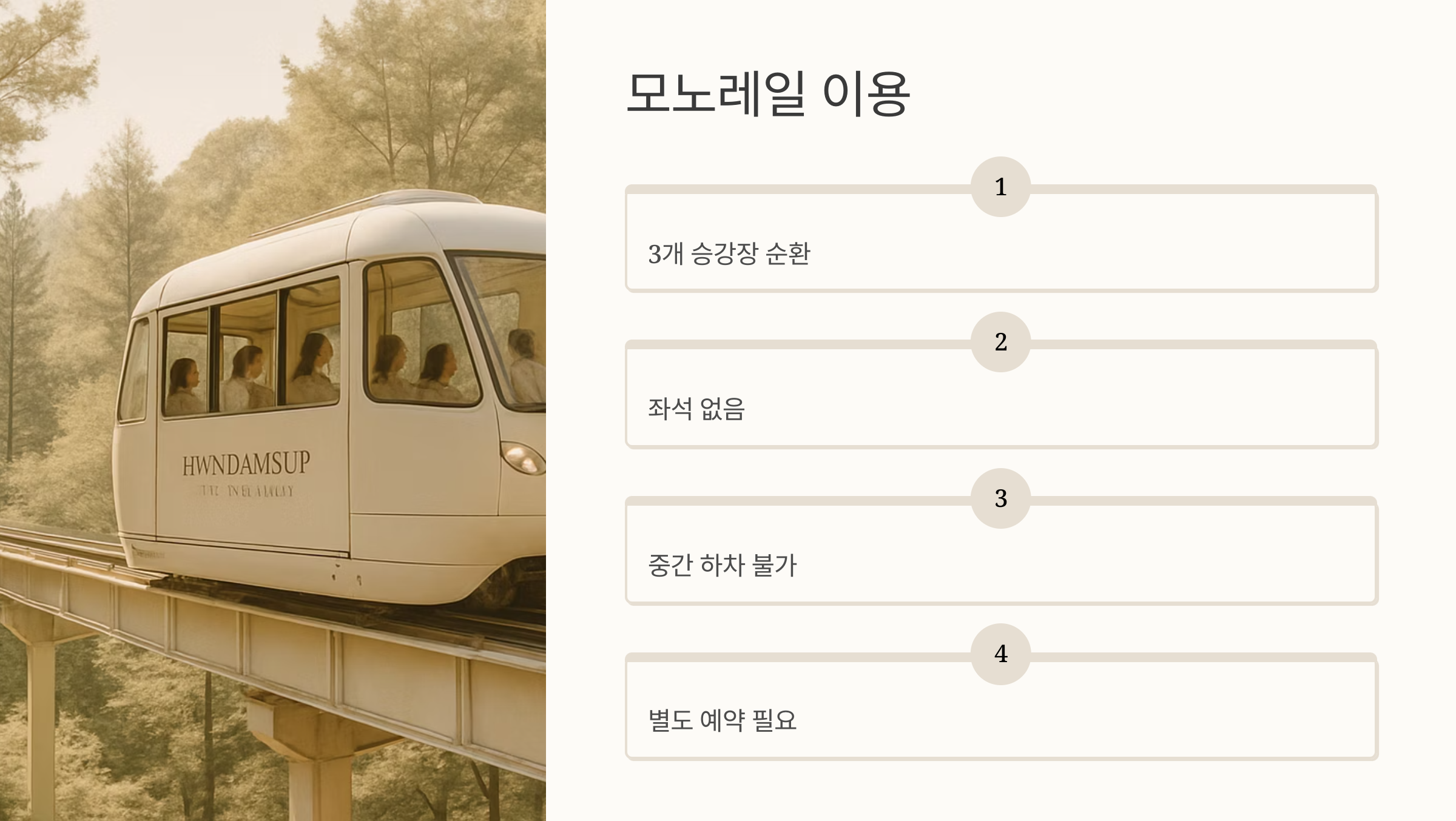 모노레일 탑승권은 따로 구매해야 하고, 특히 봄이나 가을에는 금방 매진될 수 있으니 미리 예약하는 게 좋아요. 알찬 정보들을 미리 알아두면 더욱 편리하고 즐거운 화담숲 여행이 될 거예요. 꼼꼼한 준비로 편안하고 행복한 시간을 보내시길 바랍니다.